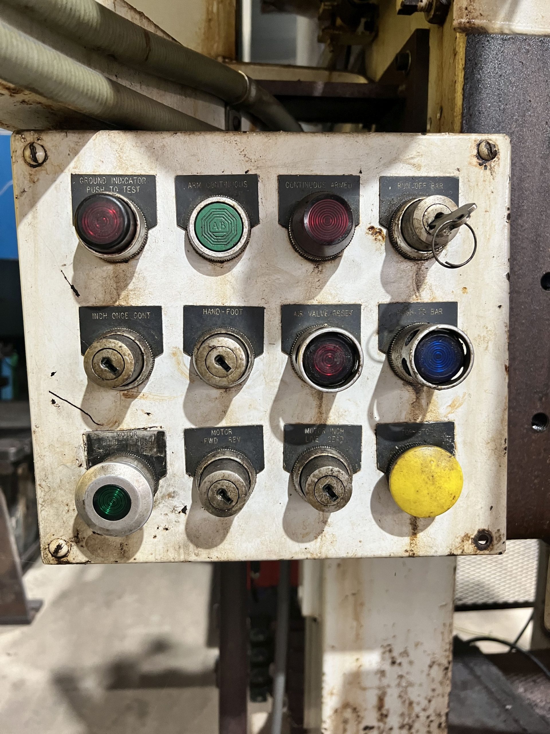 | capacity | 100 ton | stroke | 6" | max. shut to bed | 18.5" sdau | bed area | 36" x 28" (RL X FB) | speed | 45 spm | slide area | 24" X 17" (RL X FB) | slide adjustment | 3" manual | BOLSTER SIZE | 36" x 28" (RL X FB) | DISTANCE BETWEEN UPRIGHTS | 17.75" | FLOOR TO BED | 34" | CLUTCH | AIR CLUTCH AND AIR BRAKE | ELECTRICAL | 10 HP 1150 RPM 208-230/460V-3-60 BALDOR INDUSTRIAL MOTOR | 28.5-28.4/14.2 AMPS | CONTROLS | ALLEN-BRADLEY BULLETIN 700 RELAY LOGIC CONTROLLER | APPROX. DIMENSIONS | 79" X 80" (RL X FB) X 143" HIGH | APPROX. WEIGHT | 25,000 LBS. | Equipped With | __ | Note | __ |