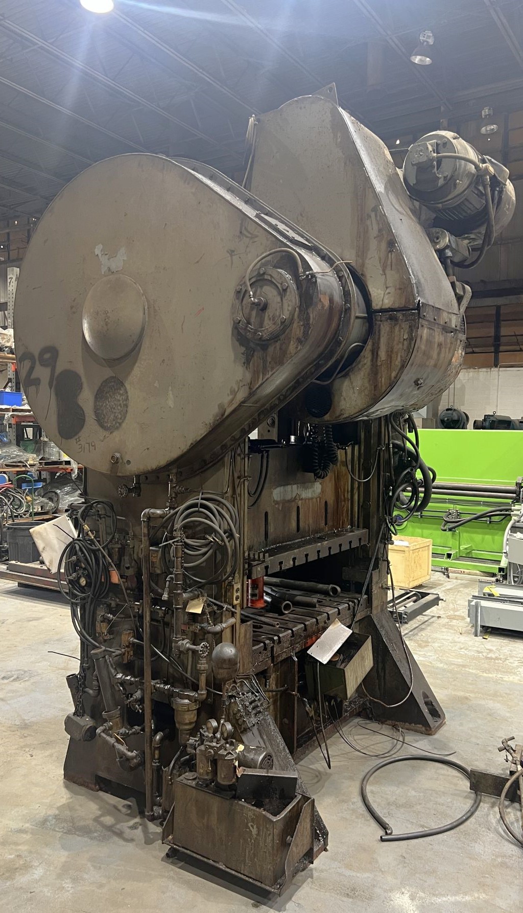 | CAPACITY | 100 TON | STROKE | 8" | MAX. SHUT HEIGHT TO BED | 20" SDAU | BED AREA | 60" X 36" (RL X FB) | SPEED | 40-80 SPM W/REEVES DRIVE | RAM AREA | 60" RL X 36" FB T-SLOTTED | RAM AJUSTMENT | 6" MOTORIZED ADJ. | BOLSTER SIZE | 60" X 36" (RL X FB) X 4" THICK T-SLOTTED BOLSTER PLATE | WINDOW SIZE | 19" WIDE X 15" HIGH | CLUTCH | CLEARING AIR CLUTCH AND BRAKE | ELECTRICS | VARIABLE SPEED DRIVE AND CONTROLS | APPROX. DIMENSIONS | 110" X 84" (RL X FB) X 152" HIGH | APPROX. WEIGHT | 31,000 LBS. | Equipped With | AIR CUSHIONS IN BASE, TIE ROD STEEL FRAME CONSTRUCTION, SINGLE BACK GEARED - SINGLE END DRIVE, FLOOR STANDING BASE, RECIRCULATING LUBRICATION SYSTEM | Note | __ |