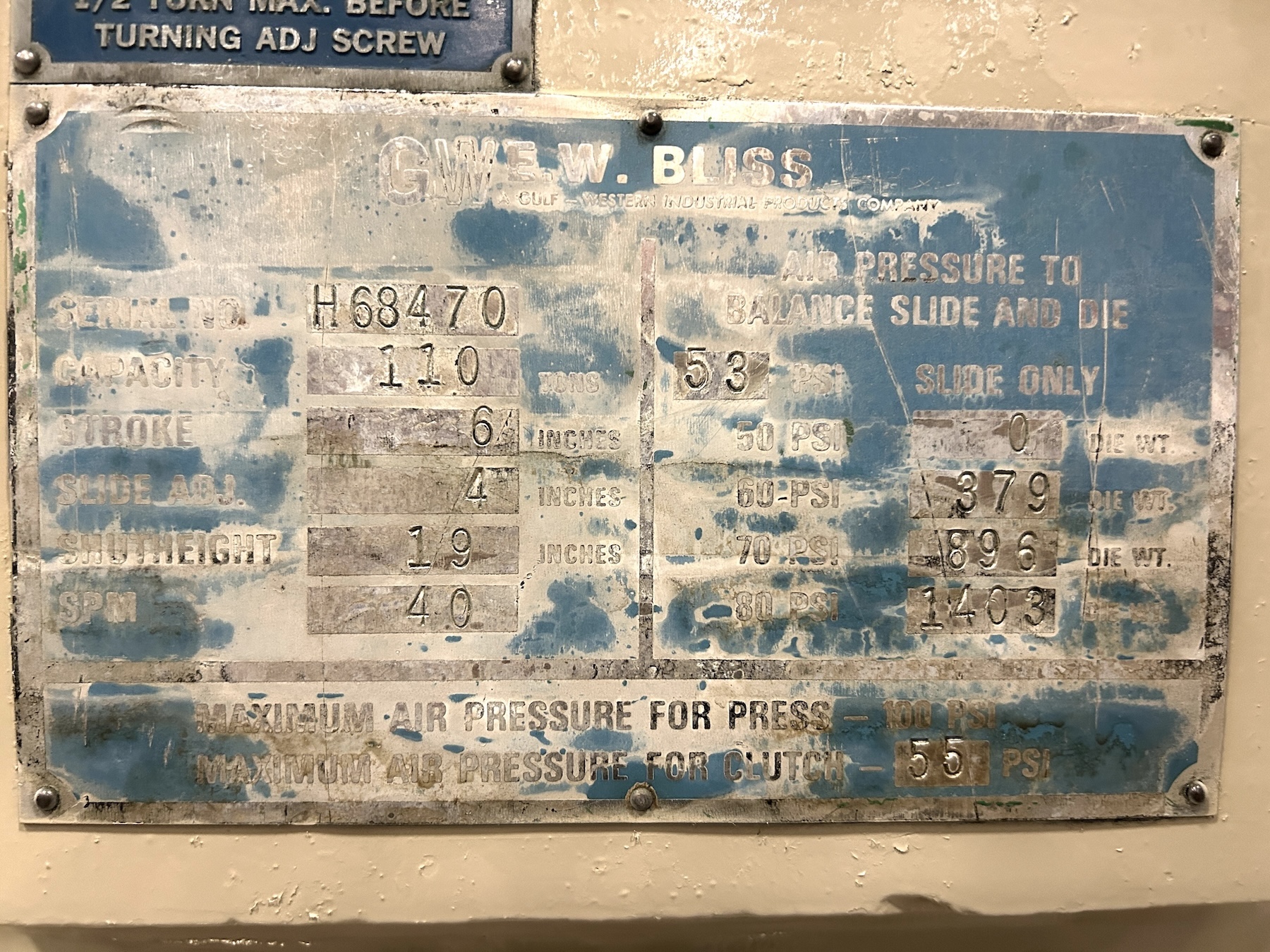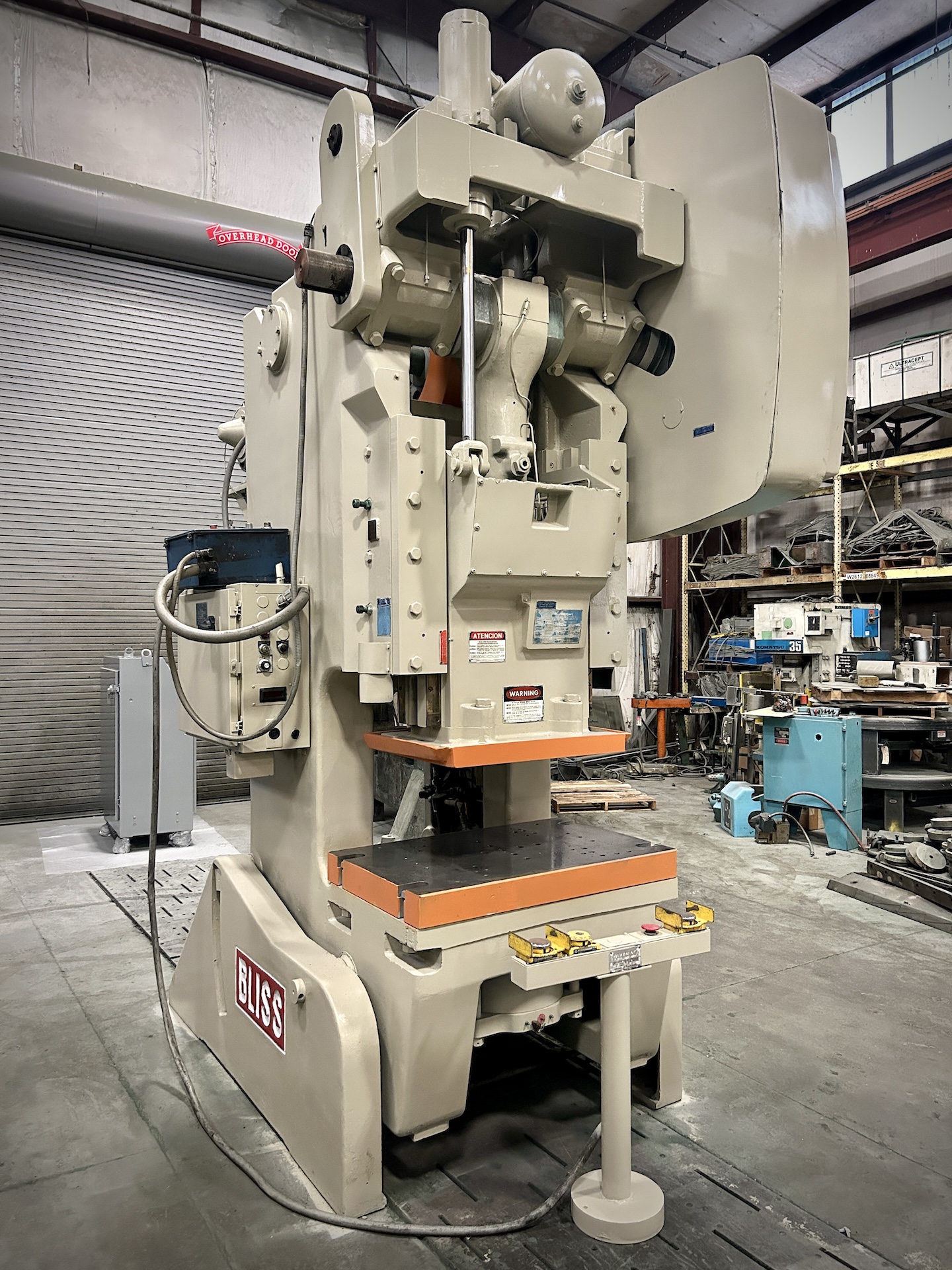 | CAPACITY | 110 TON | STROKE | 6" | MAX SHUT HEIGHT TO BED | 19" SDAU | BED AREA | 42" X 27" (rl x FB) | SPEED | 20 - 40 SPM VARIABLE | SLIDE ADJUSTMENT | 4" MOTORIZED | SLIDE AREA | 28.25" RL X 23" FB | BOLSTER PLATE | 3.5" H X 42" RL X 27" FB (SOLID) | DIST UPRIGHTS / FLOOR TO BED | 24" / 35.75" | CLUTCH | BLISS AIR CLUTCH / BRAKE COMBINATION | ELECTRICS | 20 HP 1750 RPM 240/480V-3-60 EDDY CURRENT MOTOR & EXISTING CIECO PLS-PLUS PRESS CONTROL | APPROX DIMENSIONS | 12.5' H X 100" RL X 108" FB | APPROX WEIGHT | 30,000 LBS | Equipped With | air cushion, air counterbalances, floor standing, inclinable. | Note | 5 IN STOCK |