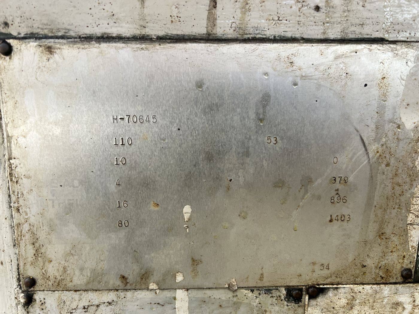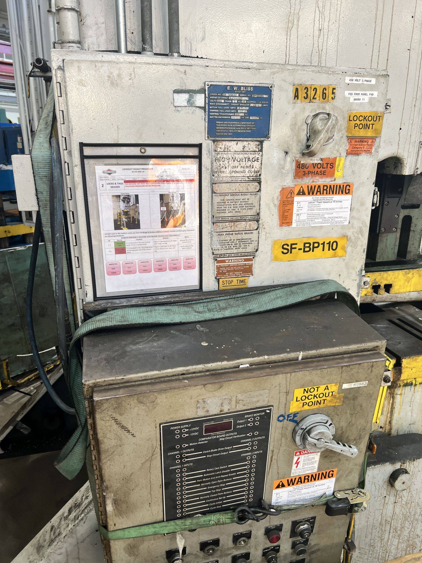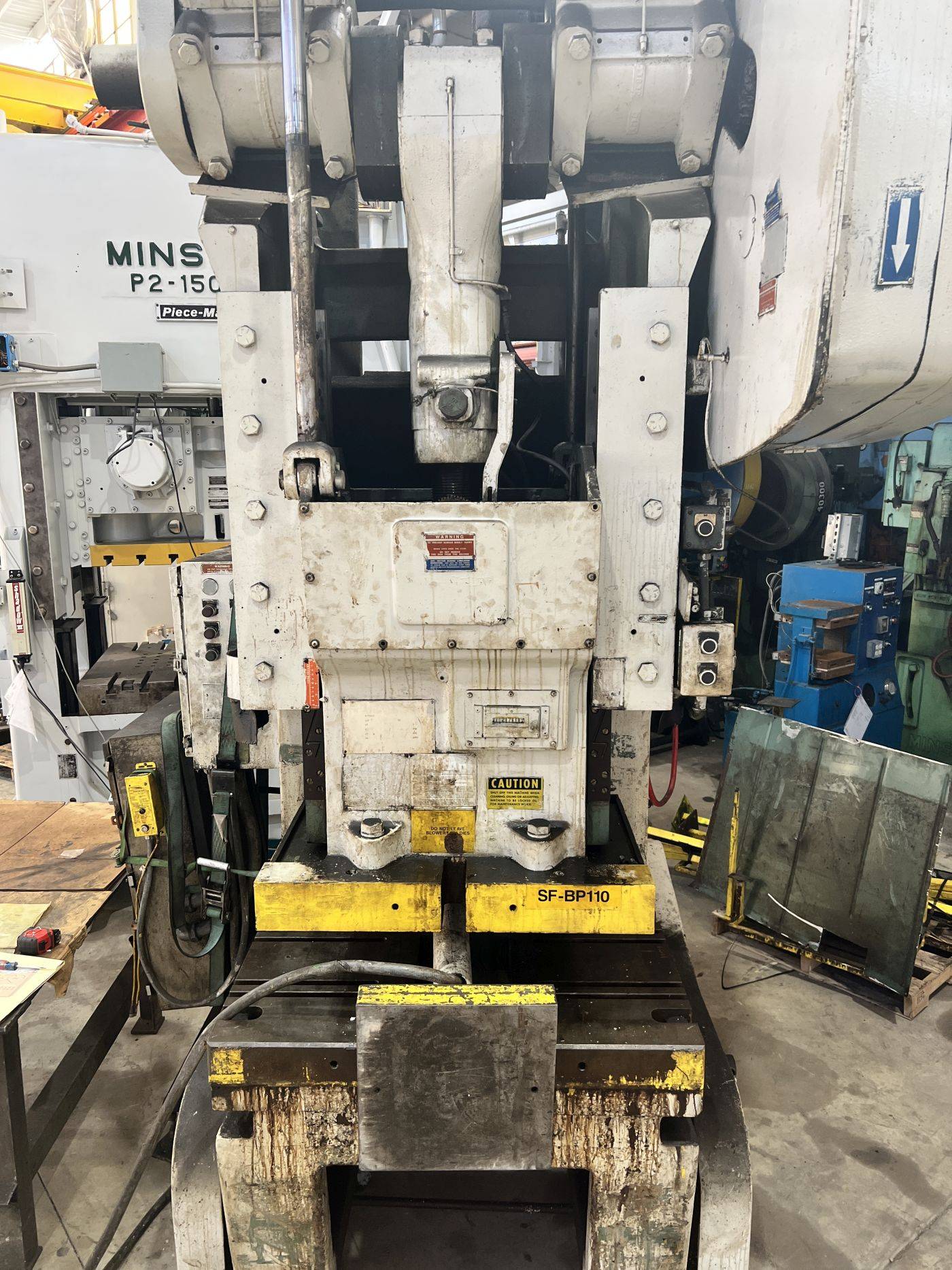 | CAPACITY | 110 TONS | STROKE | 10" | MAX SHUT HEIGHT TO BED | 16" | BED AREA | 42" X 28" (RL X FB) | BOLSTER PLATE | 42" X 28" (RL X FB) X 4" THICK T-SLOTTED PLATE | RAM AREA | 34" X 22" (RL X FB) flanged ram | RAM ADJUSTMENT | 4" | SPEED | 80 SPM | Distance betWEEN uprights | 23.5" | FLOOR TO BED HEIGHT | 36" | PRESS CONTROLS | ALLEN-BRADLEY MICRO850 / 2080 PLC CONTROLLER | CLUTCH | bliss air clutch and brake | ELECTRIC MOTOR | 10 HP 1750 RPM 230/460V-3-60 ELEKTRIM MOTOR | 26.6 / 13.3 AMPS | APPROX. DIMENSIONS | 77" X 111" (RL X FB) X 152" HIGH | APPROX. WEIGHT | APPROX. 30,000 LBS. | Equipped With | __ | Note | 5 IN STOCK This one may a variable speed drive on it - Jim 10/23 |