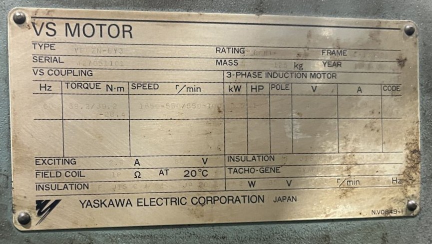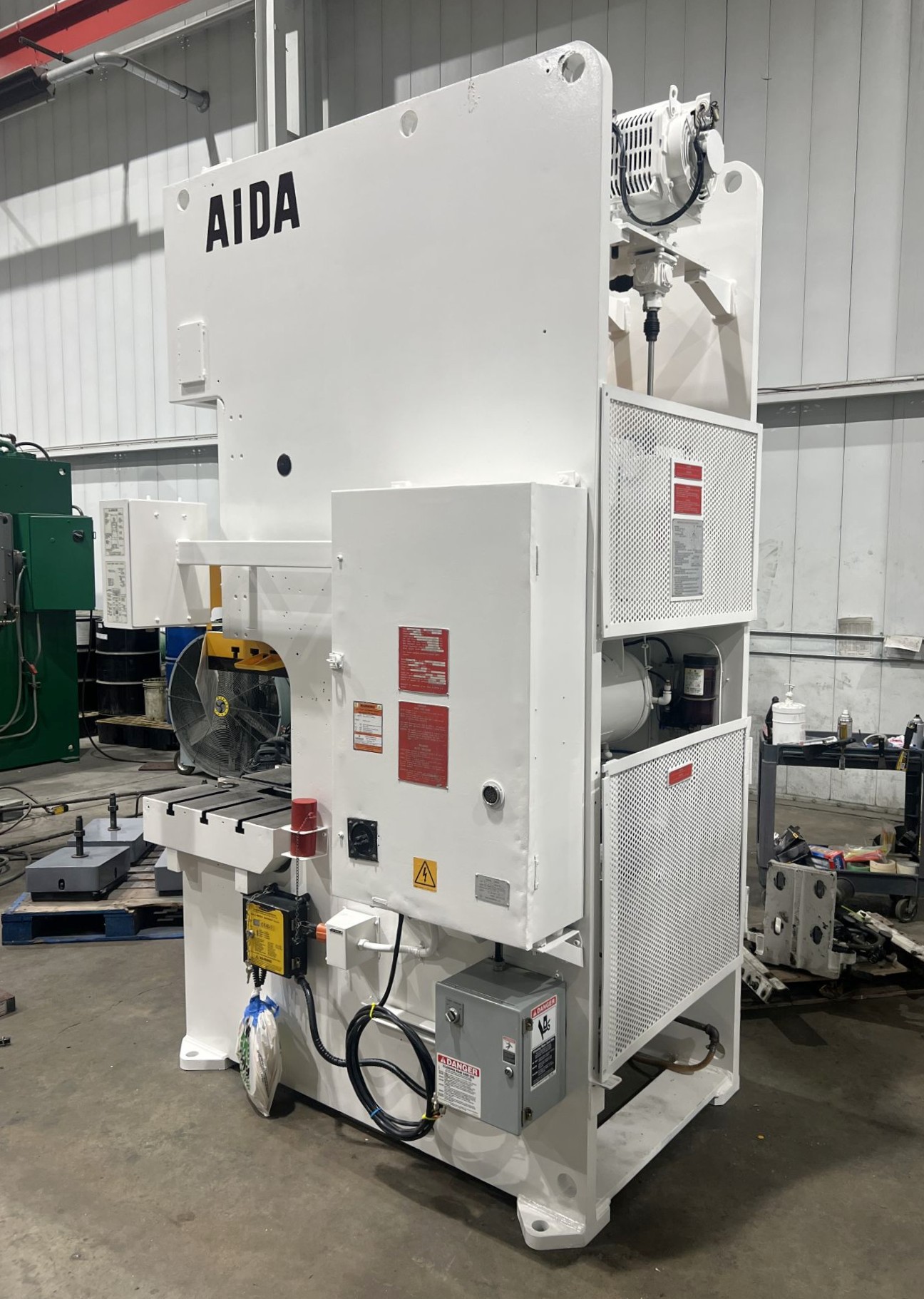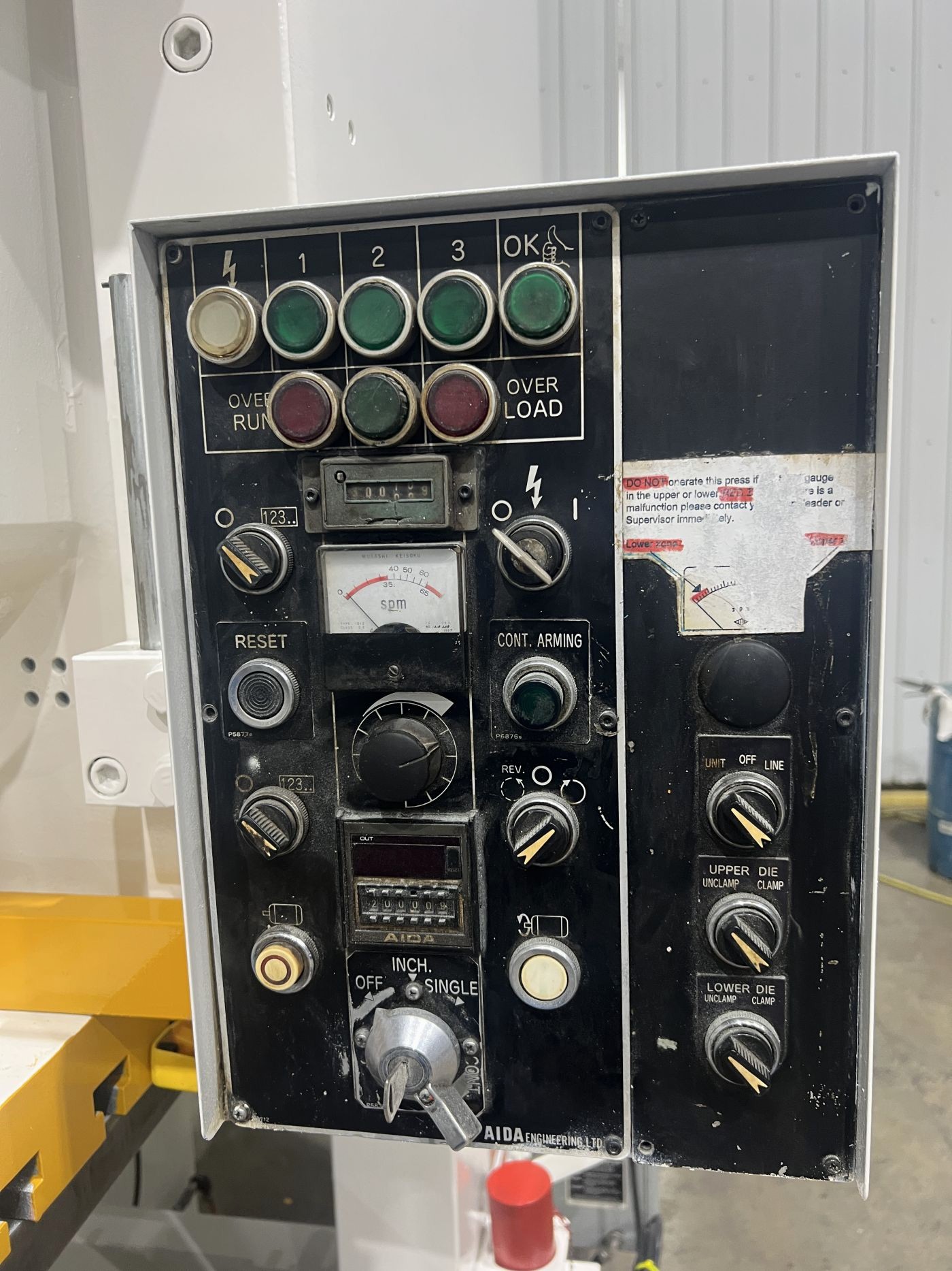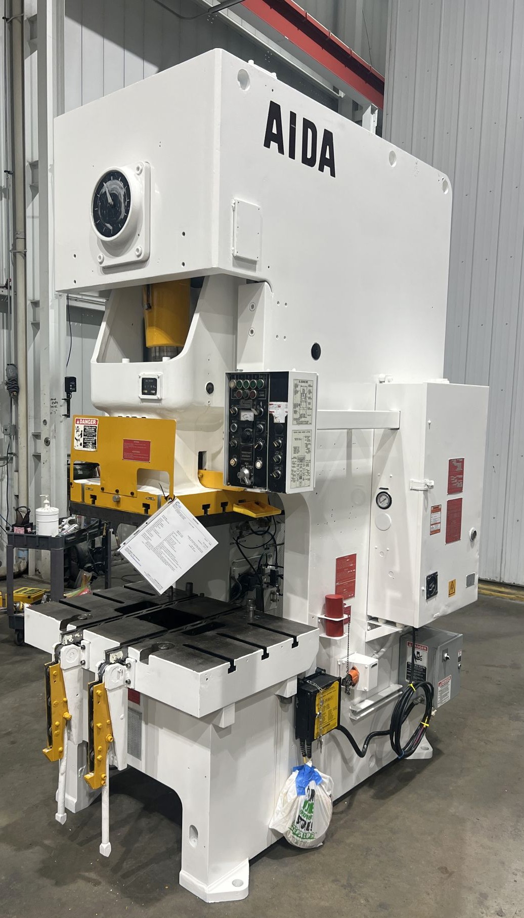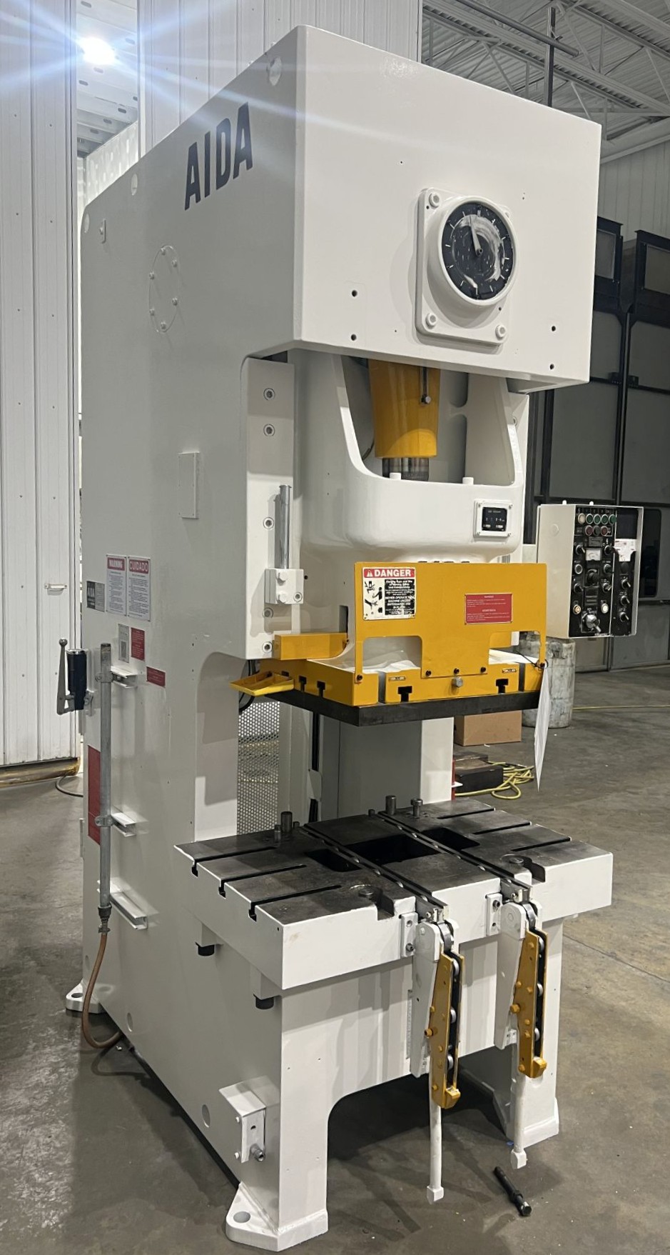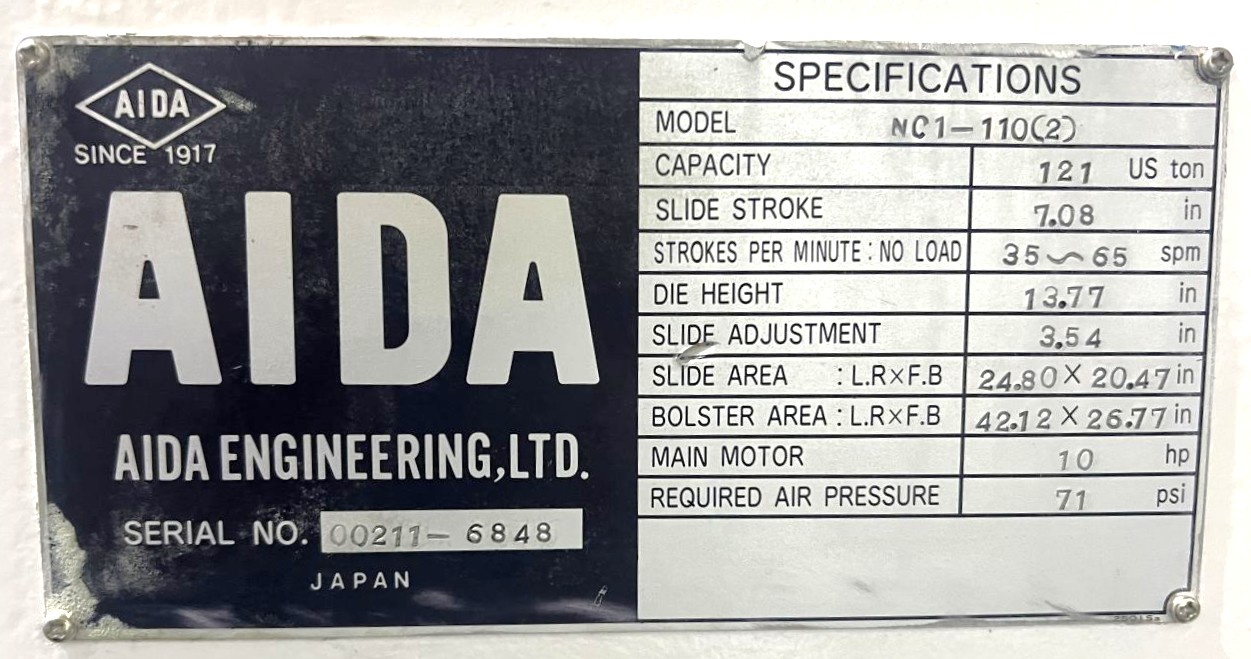 | CAPACITY | 121 US TONS | STROKE | 7.08" | max die height | 13.77" OVER BOLSTER PLATE | SLIDE ADJUSTMENT | 3.5" MOTORIZED | BED AREA | 42.12" X 26.77" (RL X FB) | BOLSTER PLATE | 42.12" X 26.77" (RL X FB) | SLIDE AREA | 24.8" X 20.47" (RL X FB) | SPEED | 35 - 65 SPM | FLOOR TO BED HEIGHT | 35.65" - 41.15" WITH ISOLATOR PADS | DISTANCE BETWEEN UPRIGHTS | 25" | THROAT | 13.75" | CLUTCH | AIDA AIR CLUTCH AND BRAKE COMBINATION | PRESS CONTROLS | AIDA CONTROLS TESTED IN INCH, JOG & CONTINUOUS | ELECTRIC MOTOR | 10 HP 460V-3-60 YASKAWA VS MOTOR (UPDATED) | 11.6 AMPS - 14 FULL LOAD AMPS | APPROX. DIMENSIONS | 59" X 81" (RL X FB) X 120" - 125.5" WHEN ON 5.5 ISOLATOR PADS | APPROX. WEIGHT | APPROX. 21,340 LBS. | Equipped With | FLOOR STANDING, SINGLE BACK GEARED, HIGHLY RIGID FRAME W/LOW ANGULAR DEFLECTION, FAST ACTING HYDRAULIC OVERLOAD SYSTEM, 6-POINT FULL LENGTH BRONZE GIBS, QUILL MOUNTED FLYWHEEL W/FLYWHEEL BRAKE | Note | 71 PSI REQUIRED |