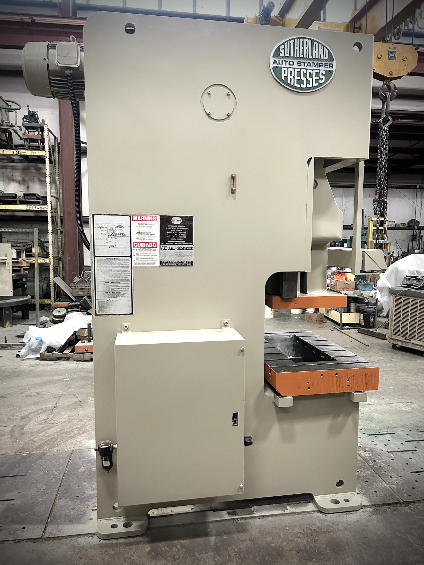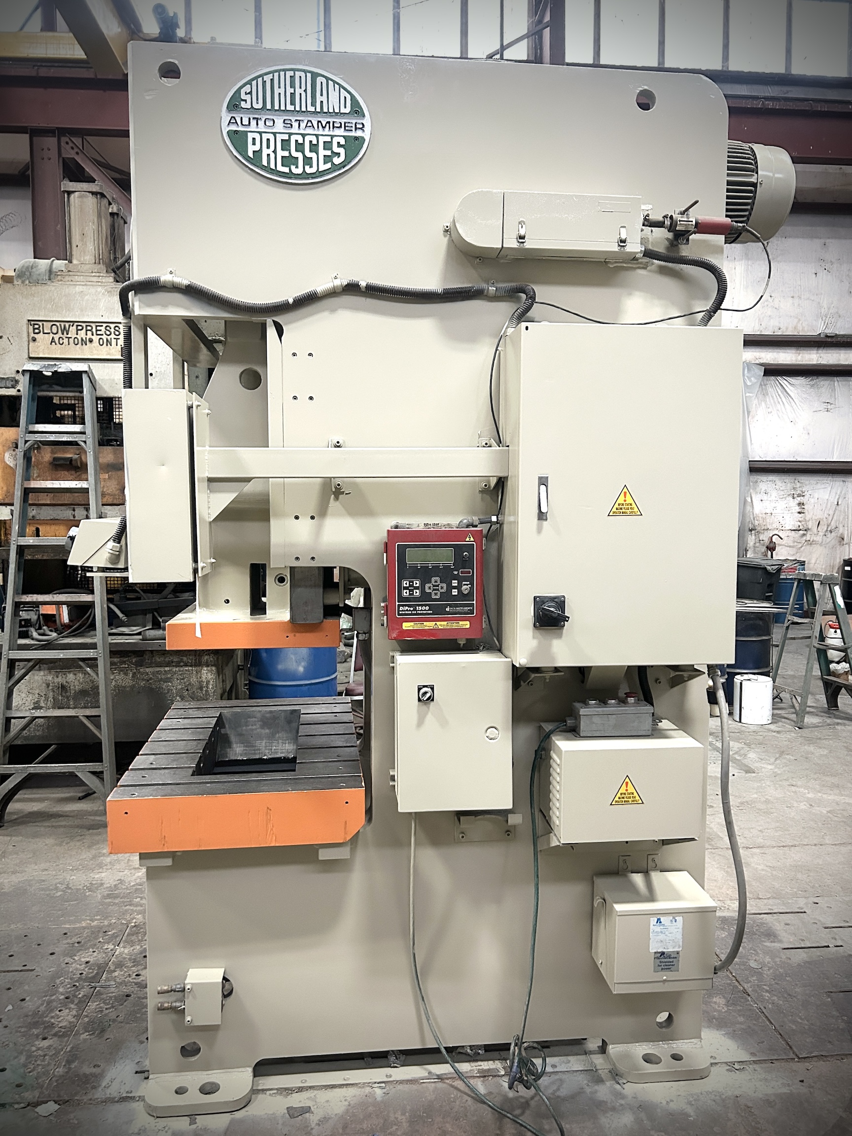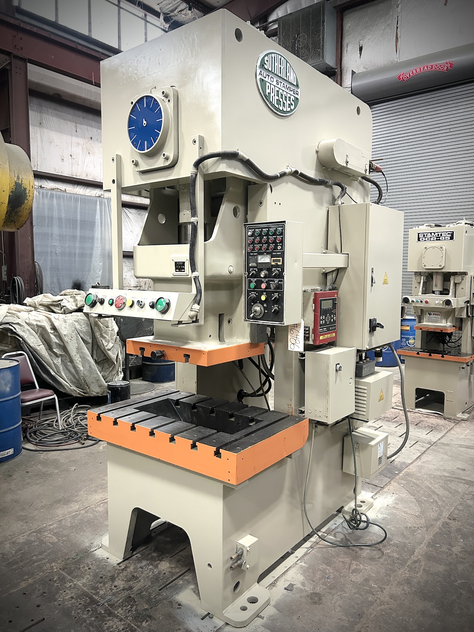 | CAPACITY | 121 US TONS | STROKE | 4.3" | MAX DIE HEIGHT | 12.6" SDAU OVER 6" H BOLSTER PLATE | SLIDE ADJUSTMENT | 3.5" MOTORIZED | BED AREA | 45.3" X 27.6" (RL X FB) | BOLSTER PLATE | 6" H X 45.3" RL X 27.6 FB (T-SLOTTED) | SLIDE AREA | 25.6" RL X 20.5" FB (t-slotted) | SPEED | 45 - 90 SPM | FLOOR TO BED HEIGHT | 31" | DISTANCE BETWEEN UPRIGHTS | 26.3" | CLUTCH | SUTHERLAND AIR CLUTCH / BRAKE COMBINATION | ELECTRICS | 15 HP 1750 RPM 240/480V-3-60 & SUTHERLAND PLC PRESS CONTROL | APPROX. DIMENSIONS | 120" H X 67" RL X 80" FB | APPROX. WEIGHT | 21,500 LBS | Equipped With | FLOOR STANDING, HYDRAULIC OVERLOADS, AIR COUNTERBALANCE, BACK GEARED | Note |