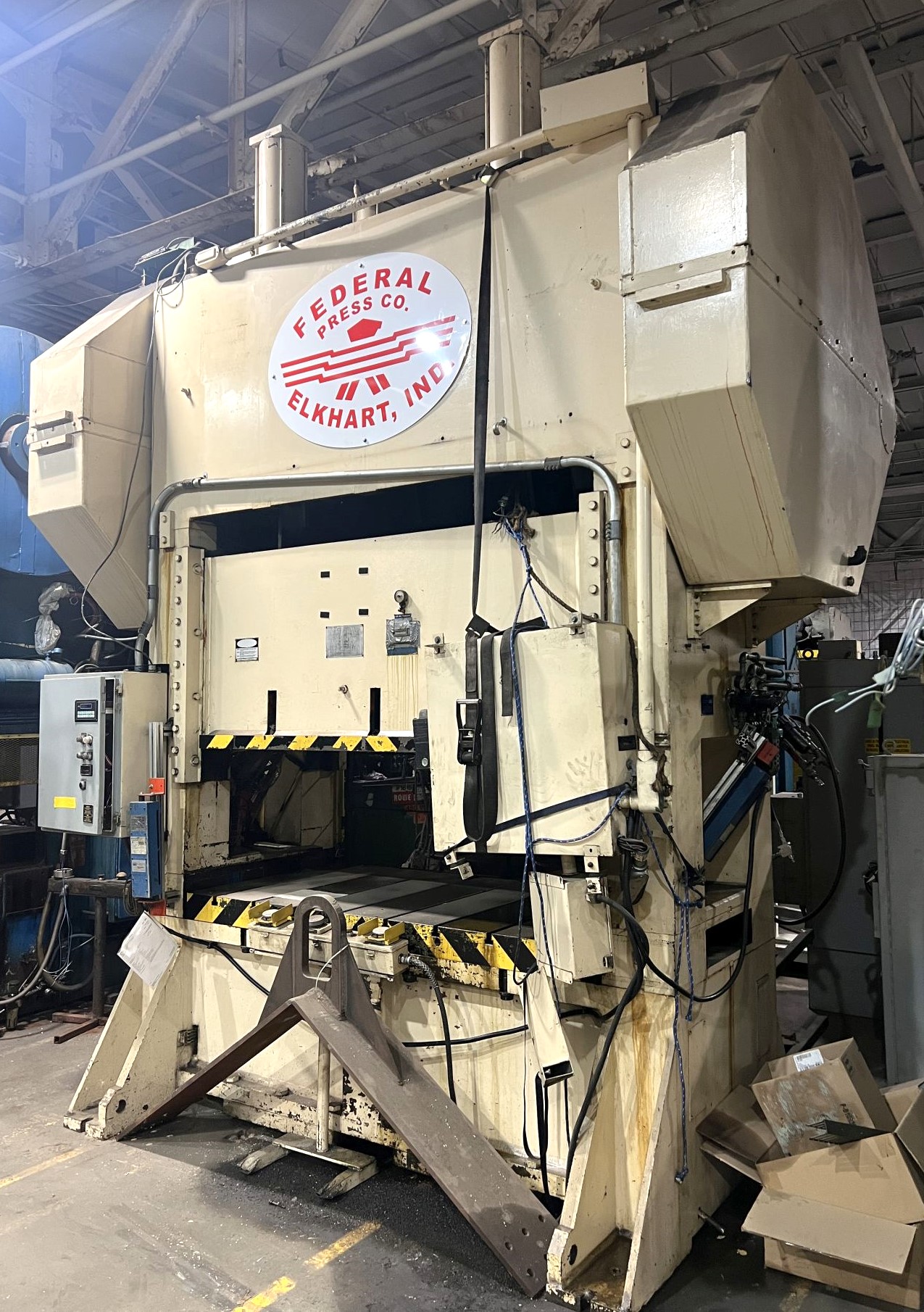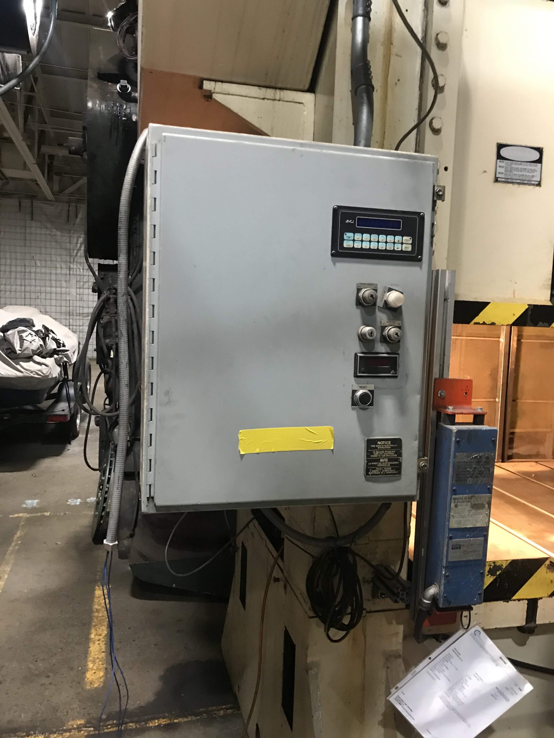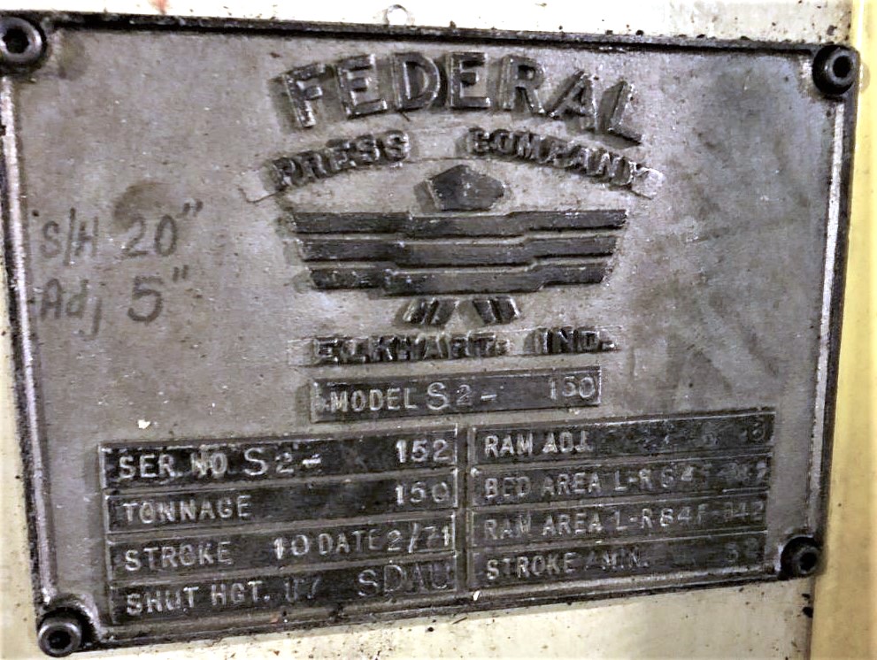 | CAPACITY | 150 TONS | STROKE | 10" | MAX SHUT HEIGHT TO BED | 17" SDAU (MODIFIED TO 20") | BED AREA | 84" X 42" (RL X FB) | SPEED | 32 SPM | RAM ADJUSTMENT | 8" MOTORIZED (MODIFIED TO 5") | RAM AREA | 84" X 42" (RL X FB) | BOLSTER PLATE | 84" X 42" (RL X FB) X 4.75" H T-SLOTTED BOLSTER PLATE | DIST UPRIGHTS / FLOOR TO BED | 86" / 34" | WINDOW SIZE | 20" WIDE X 24" HIGH | CLUTCH | FEDERAL AIR CLUTCH & BRAKE | APPROX DIMENSIONS | 156" X 96" (RL X FB) X 185" HIGH | APPROX WEIGHT | 63,000 LBS | Equipped With | FLOOR STANDING, 4 AIR COUNTERBALANCES, LINCOLN CENTRO-MATIC OIL LUBRICATION SYSTEM, TWIN GEAR, SINGLE BACK GEARED DESIGN, 8" SPACERS IN UPRIGHTS | Note | __ |