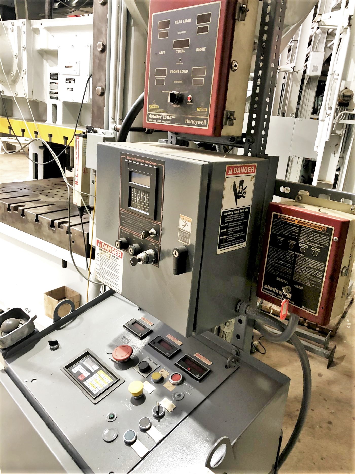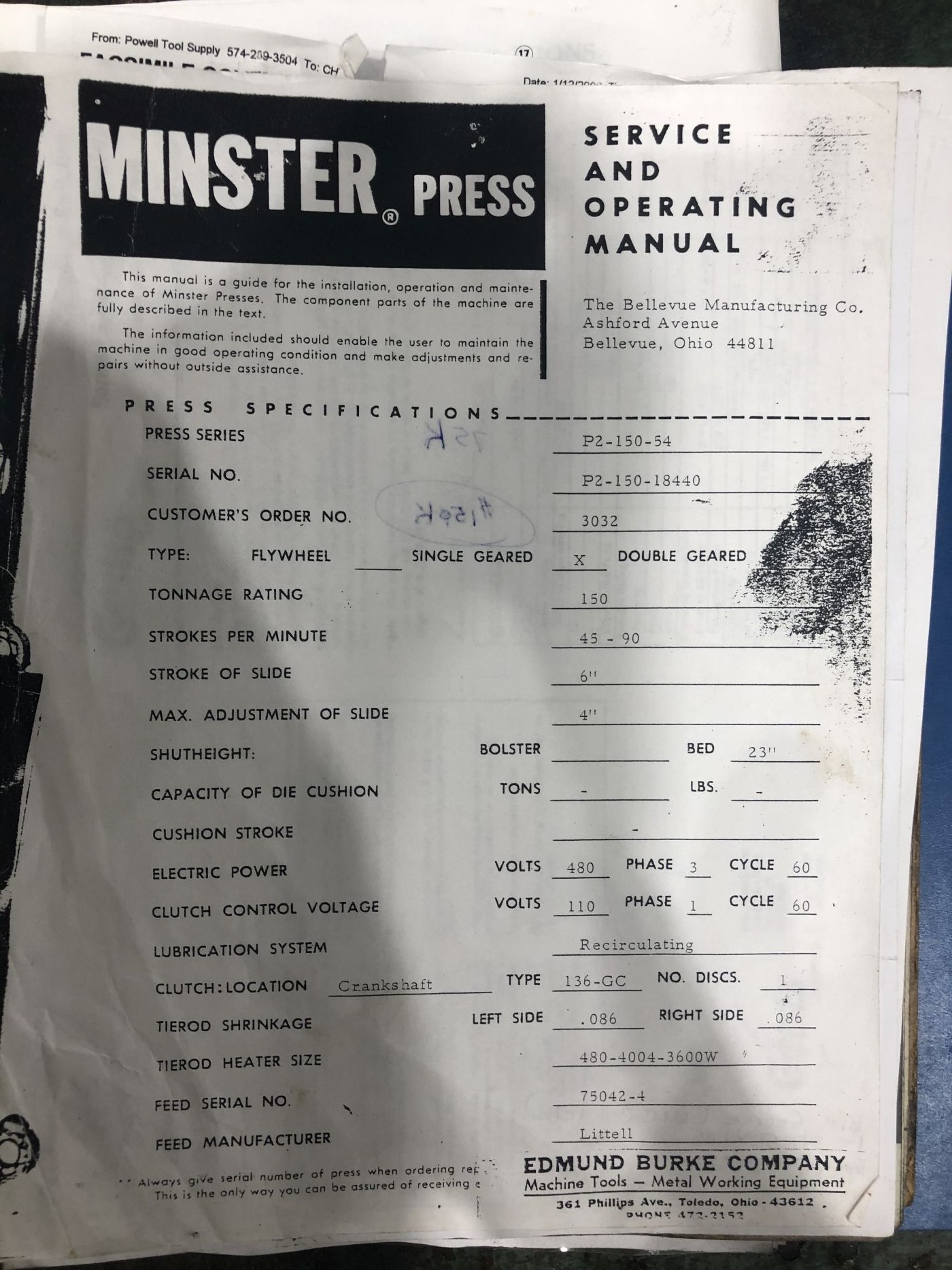 | CAPACITY | 150 TONS | STROKE | 6" | MAX. SHUT HEIGHT TO BED | 23" | BED AREA | 54" X 40" (RL X FB) | SPEED | 45 - 90 STROKES PER MINUTE | RAM ADJUSTMENT | 4" motorized | RAM AREA | 54" X 23" (RL X FB) | BOLSTER PLATE | 54" X 40" (RL X FB) | DISTANCE BETWEEN UPRIGHTS | APPROX. 56" | FLOOR TO BED | 40.5" | WINDOW SIZE | 20" WIDE | CLUTCH | MINSTER AIR CLUTCH / BRAKE COMBINATION | PRESS CONTROLS | UPDATED ROCKford SSC-1500 CONTROLLER | ELECTRICS | 480V-3-60 | APPROX. DIMENSIONS | 132" X 84" (RL X FB) X 168" HIGH | APPROX. WEIGHT | 47,000 LBS. | Equipped With | single back geared, floor standing, tie rod frame, recirculating lubrication system | Note | __ |