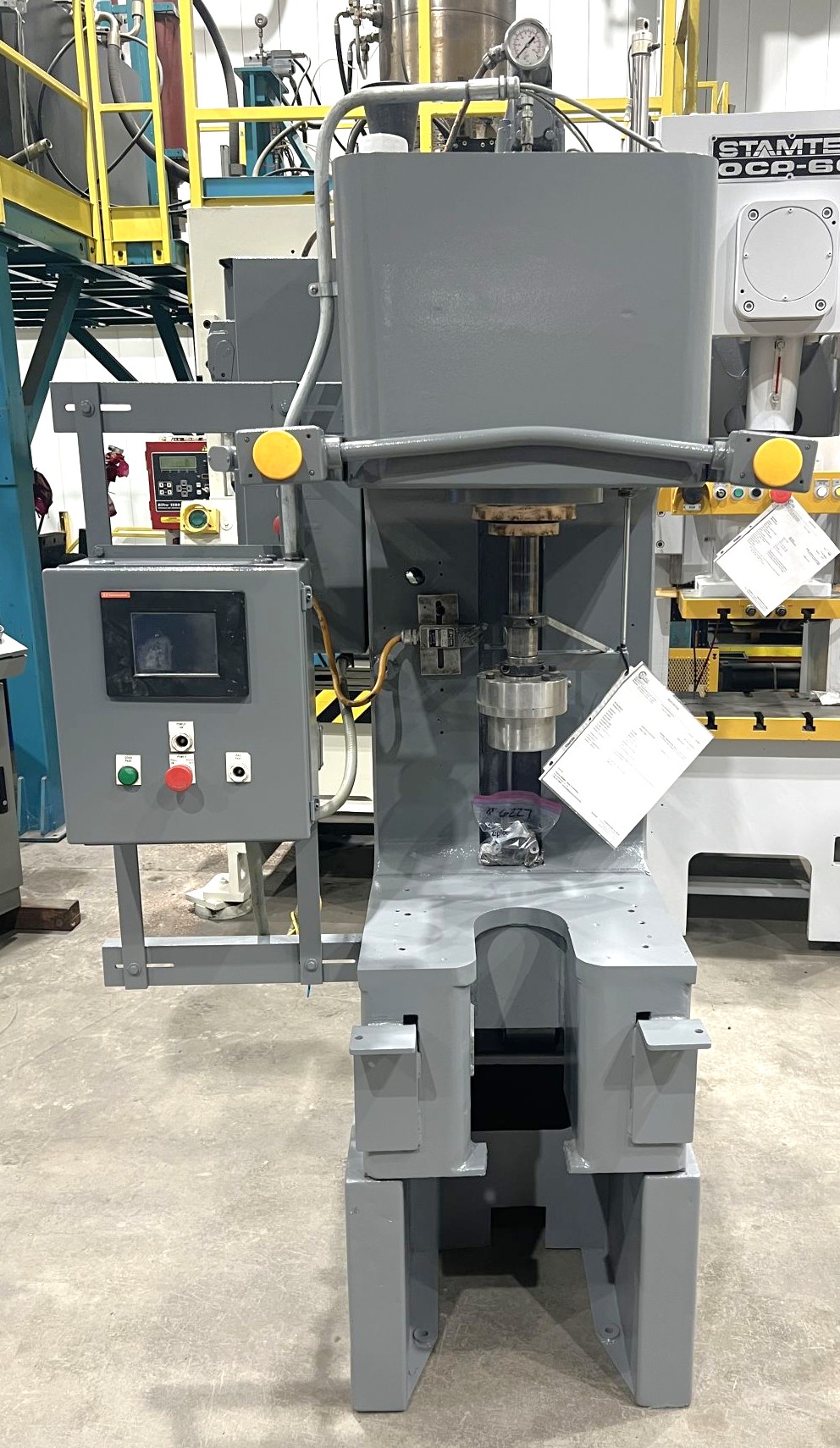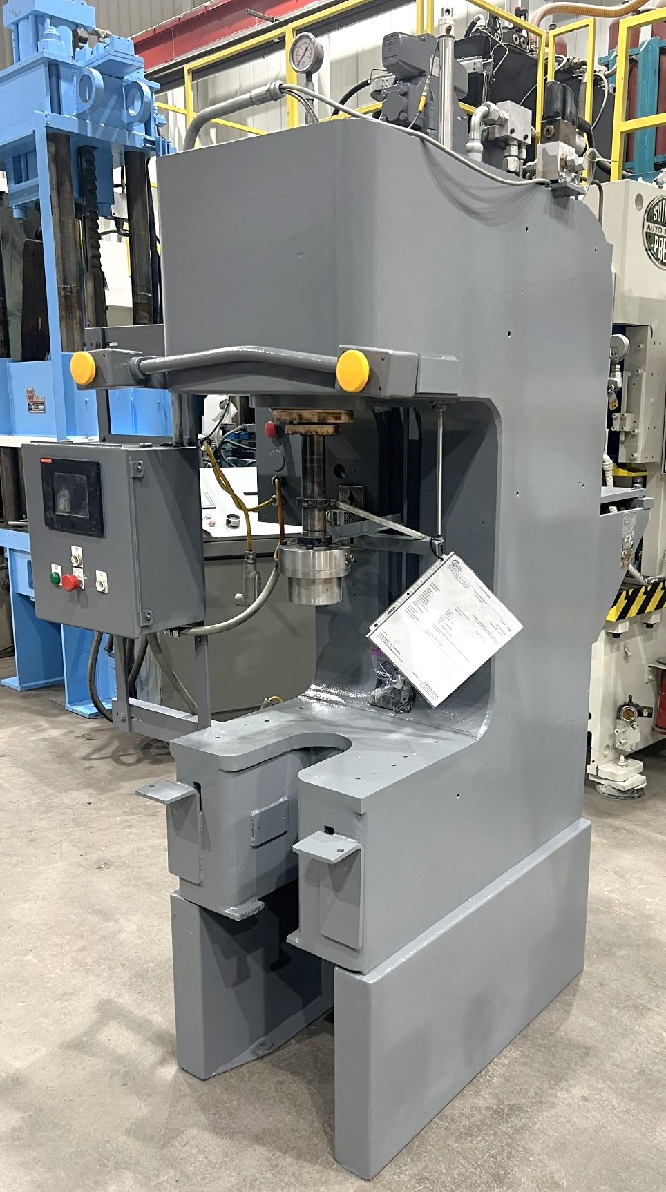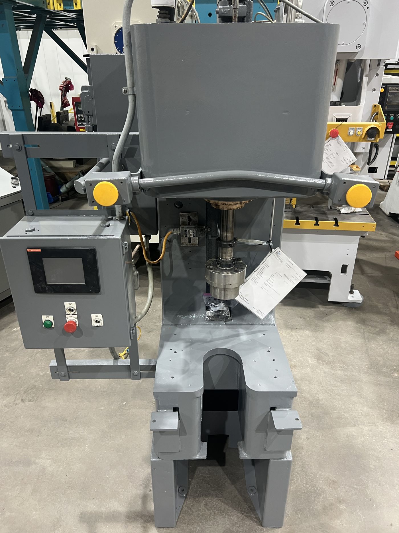 | CAPACITY | 20 TONS | STROKE | APPROX. 12" | DAYLIGHT | APPROX. 20" | BED AREA | 21" X 19" (RL X FB) | RAM ROD SIZE | 2" DIA. | CYLINDER SIZE | APPROX. 4" DIA. BORE | THROAT DEPTH | 12.25" | FLOOR TO BED HEIGHT | 15" ON 18" RISER = 33" TOTAL | SPEEDS | rapid advance - 940 ipm pressing - 90 ipm return - 605 ipm | PRESS CONTROLS | ALLEN-BRADLEY RELAY LOGIC CONTROLLER WITH EZ AUTOMATION TOUCHSCREEN | HYDRAULICS | __ | ELECTRICAL | approx. 20 hp 1750 rpm 480v-3-60 motor | APPROX. DIMENSIONS | 48" X 65" (RL X FB) X 93" HIGH | APPROX. WEIGHT | 3,800 LBS. | Equipped With | __ | Note | __ |