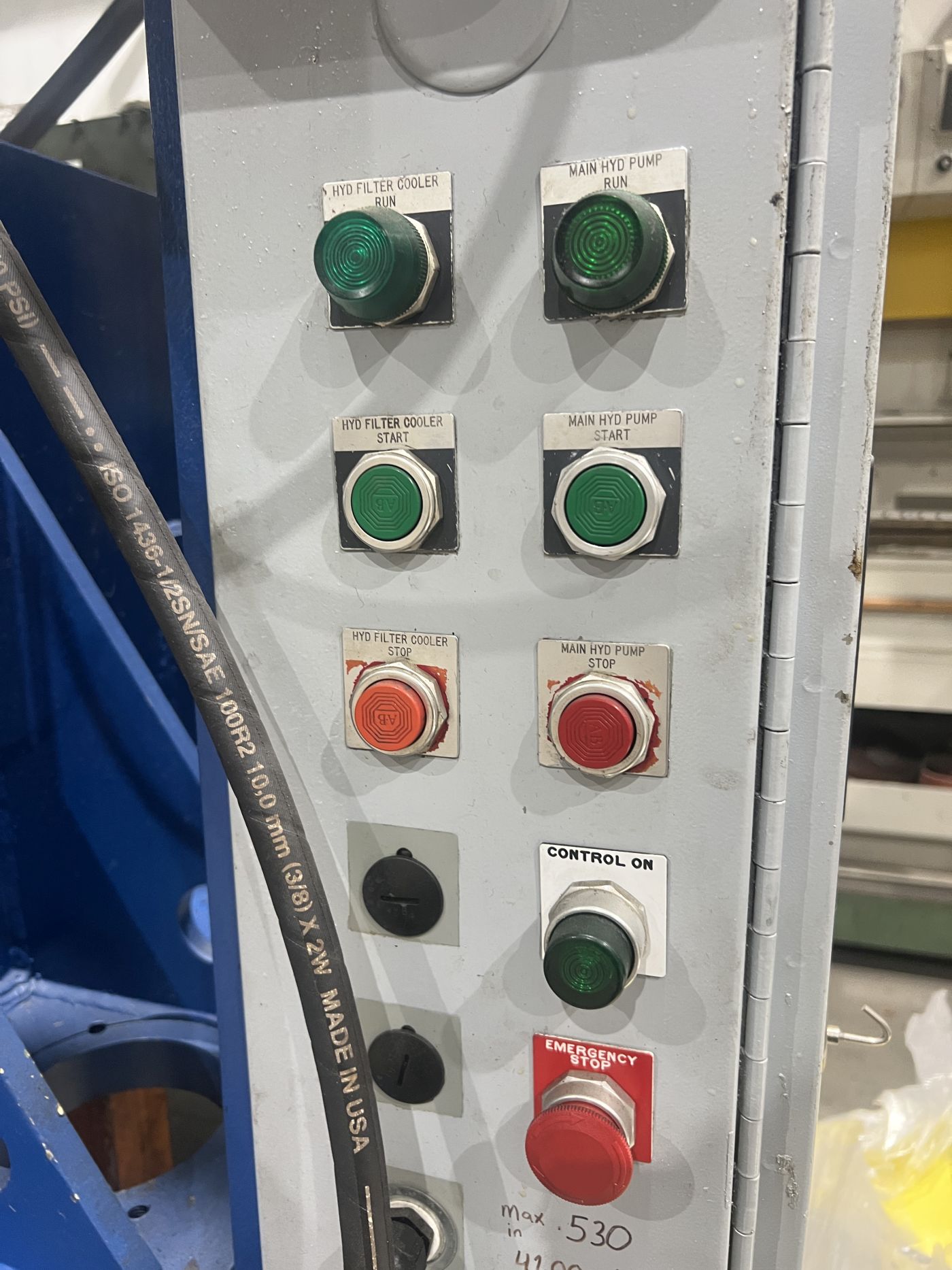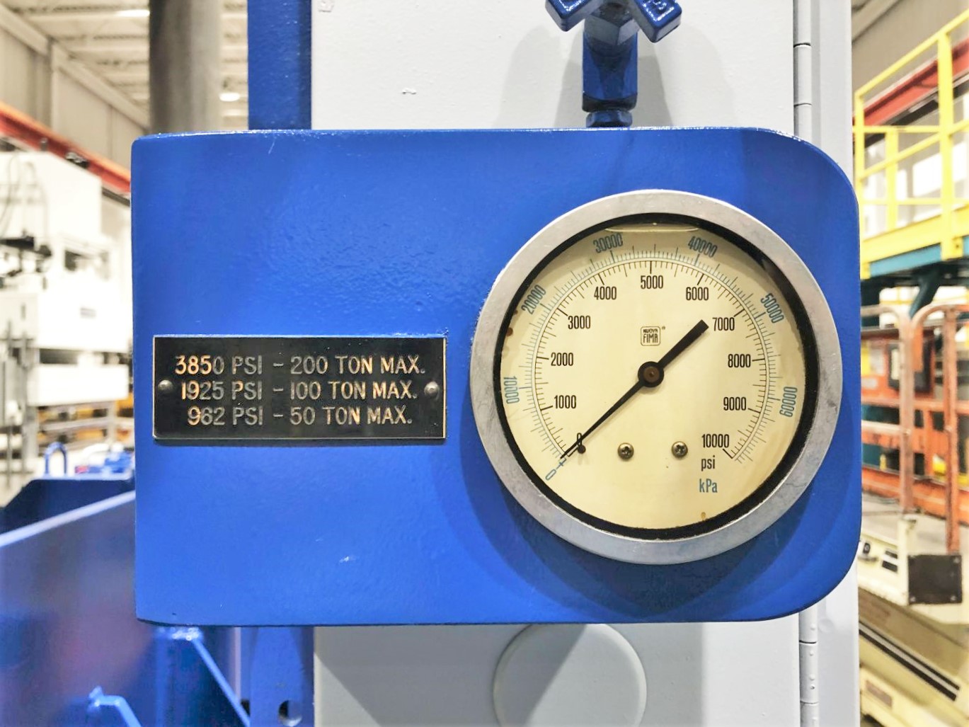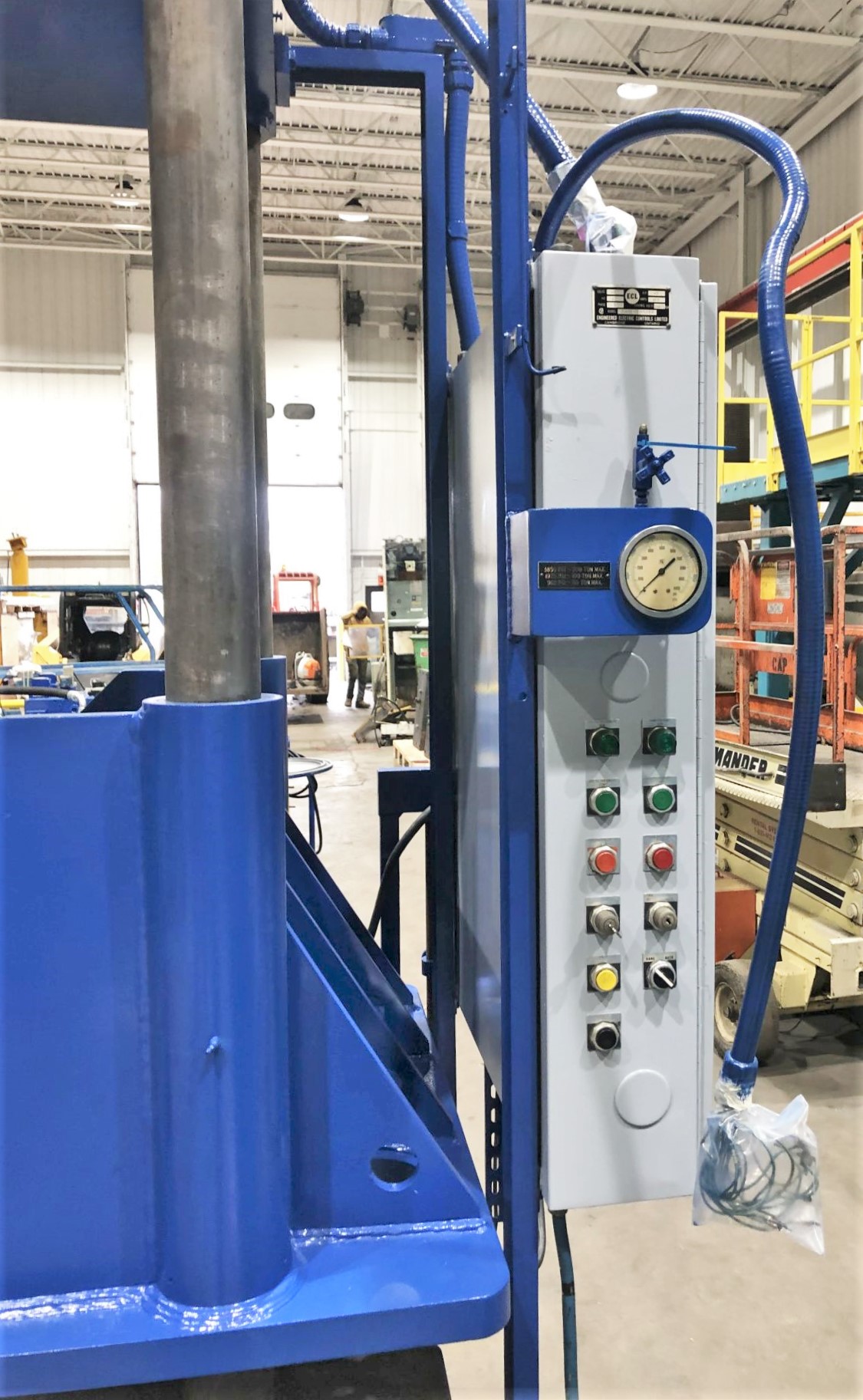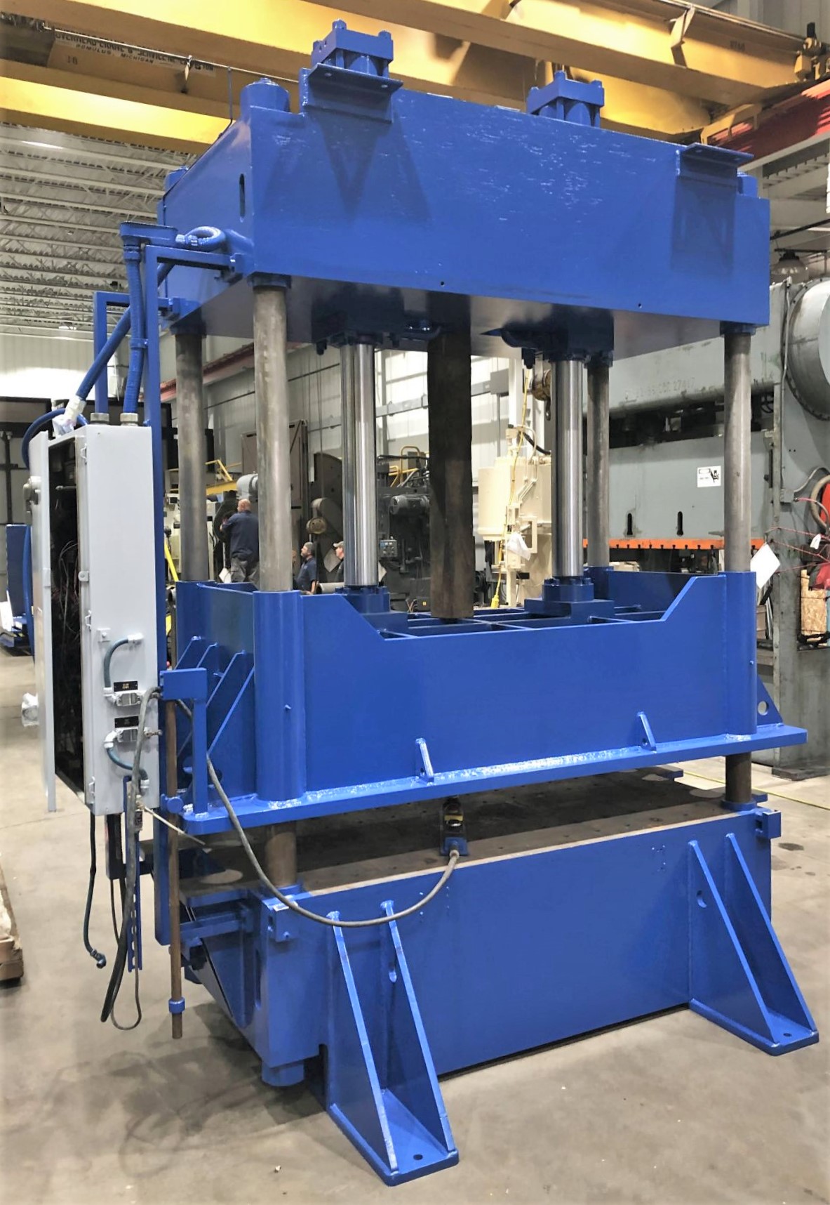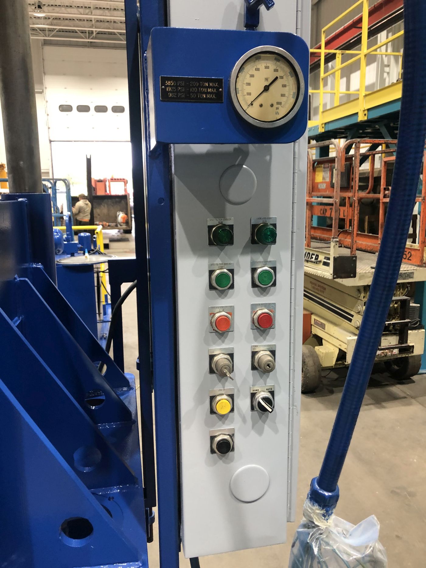 | MAX. CAPACITY | 200 TONS AT 3,850 PSI | MAX. STROKE | APPROX. 30" (MIGHT BE 35") | MAX. DAYLIGHT | 44.75" | OVERALL BED AREA | 106" X 45.75" (RL X FB) | OVERALL RAM / SLIDE AREA | 108" X 46.5" (RL X FB) | DISTANCE BETWEEN POST COLLARS | 76.5" X 31.75" (RL X FB) | DISTANCE BETWEEN POSTS | 78" X 33.25" (RL X FB) | USABLE BED AREA | 76.5" X 45.75" (RL X FB) OR 106" X 33.25" (RL X FB) | RAM ROD SIZES | (2) 5.25" DIA. | CYLINDER SIZES | (2) APPROX. 8.25" DIA. BORE | POSTS / 4 COLUMNS SIZE | 4" DIA. | FLOOR TO BED HEIGHT | 30" | PRESS CONTROLS | UPDATED ALLEN-BRADLEY MICROLOGIX 1400 WITH TOUCHSCREEN CONTROLLER | HYDRAULICS | REXROTH AA4VSO250DRG HYDRAULIC PUMP 22R-PKD63N00 | 264 GAL. RESERVOIR | ELECTRIC MOTOR | 40 HP 208-230/460V-3-60 LEESON MOTOR | 104-95.2/46.6 AMPS | OVERALL DIMENSIONS | 125" X 92" (RL X FB) X 206" HIGH WITH HYDRAULIC UNIT MOUNTED ON TOP | OVERALL WEIGHT | APPROX. 40,000 LBS. | Equipped With | __ | Note | RECIRCULATING PUMP SEAL HAS BEEN INSTALLED (MISSING IN VIDEO) |