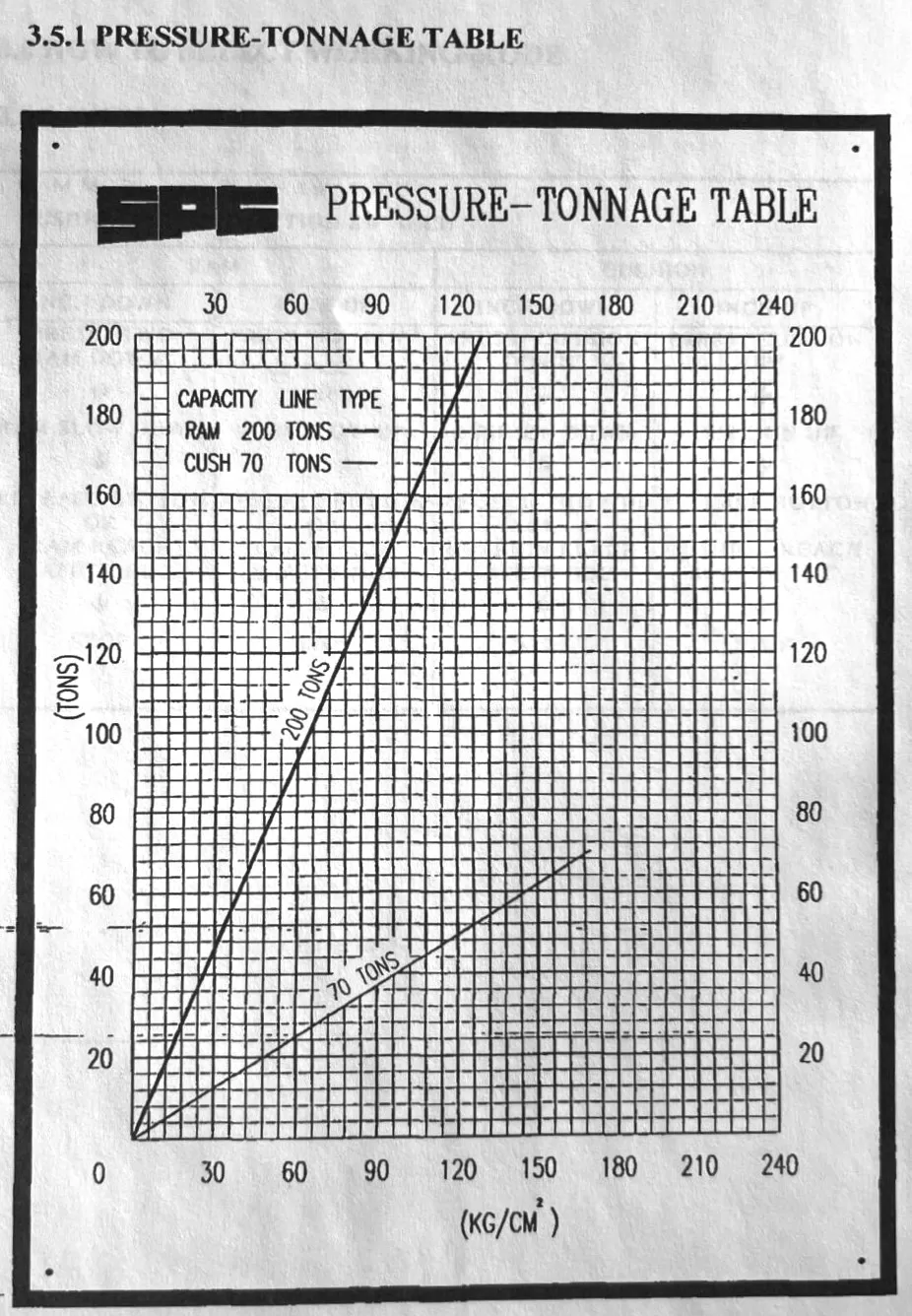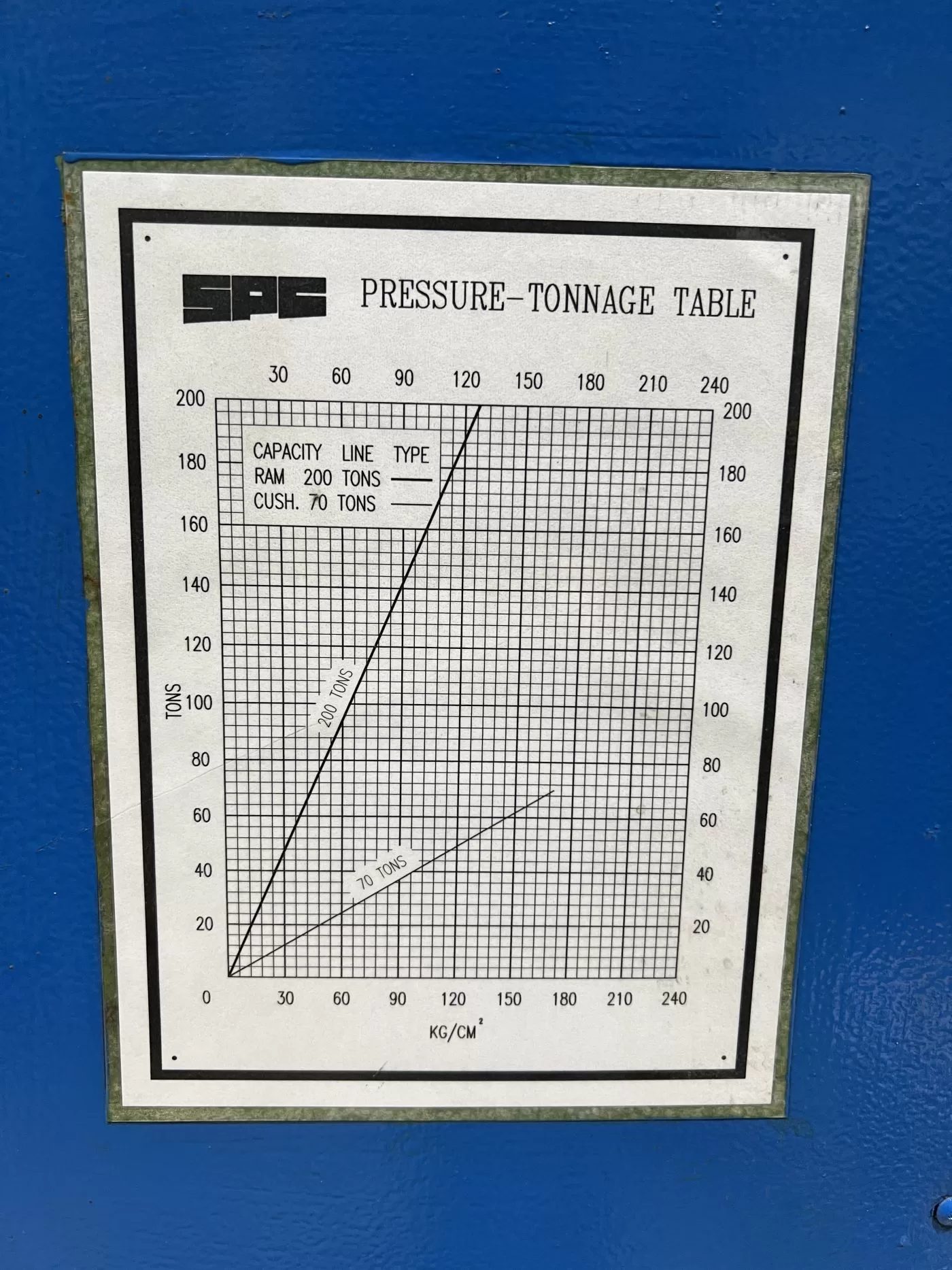 | MAX. CAPACITY | 200 TONS | Stroke | 44" | Max Daylight | 47" | Overall Bed & Ram Area | 73" x 39.375" (RL X FB) | Distance Between Posts | 61" X 41.5" (RL X FB) | Useable Bed Area | 61" X 39.375" (RL X FB) | bolster plate | 59" x 39.375" (RL X FB) X 4.75" THICK | SpeedS | 396 CLOSING / 36-69 PRESSING / 300 RETURN - INCHES PER minute | Floor to Bed Height | 57.625" | cylinder size | 12.2" DIA Bore | ram rod size | 11.4" dia. | posts/4 column size | 4.5" DIA. | press controls | ALLEN-BRADLEY MICROLOGIX 1500 CONTROLLER | main motor | 40 HP 240/460V-3-60 AEEF MOTOR | 92/46 AMPS | HYDRAULIC UNIT | T6DC-038-031-1r01-b1 PARKER HANNIFIN VANE PUMP | approx dimensions | 96" x 84" (LR x FB) x 192" HIGH | approx weight | APPROX. 30,000 lbs | Equipped With | 70 TON CUSHION IN BED - 15" STROKE - CUSHION TABLE SIZE: 47" x 31.5" (LR x FB) | Note | __ |