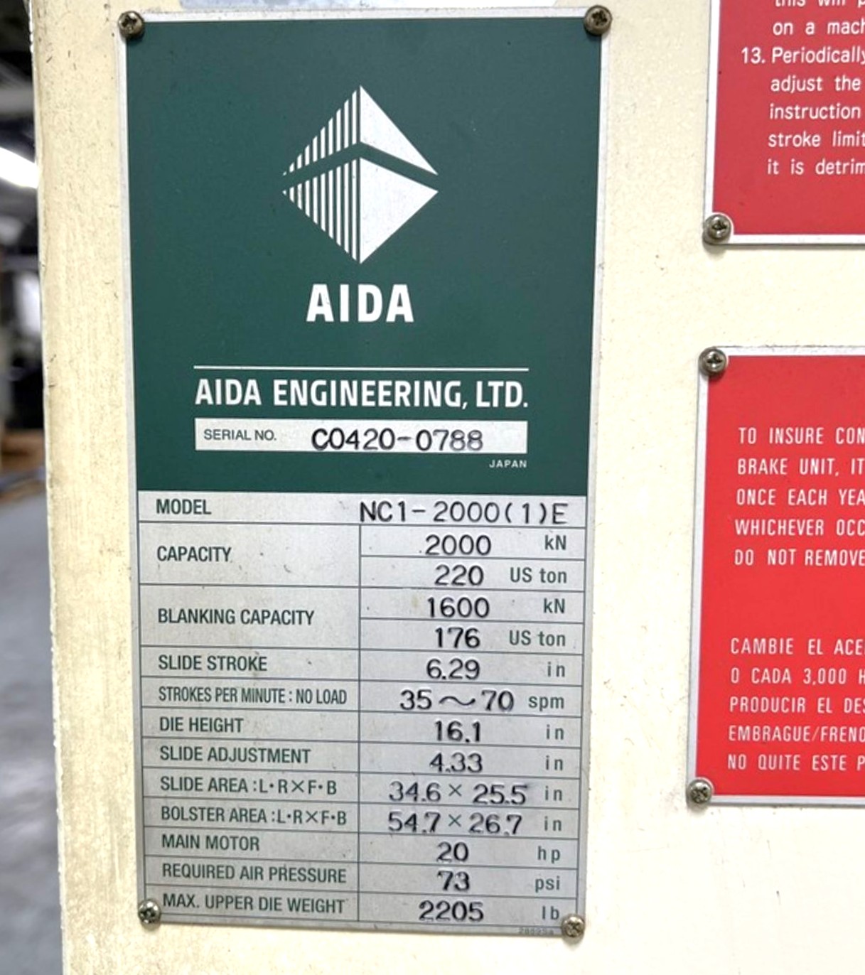 220 Ton Aida Press • Used Aida NC1-2000(1)E Press