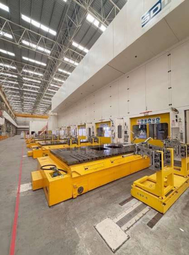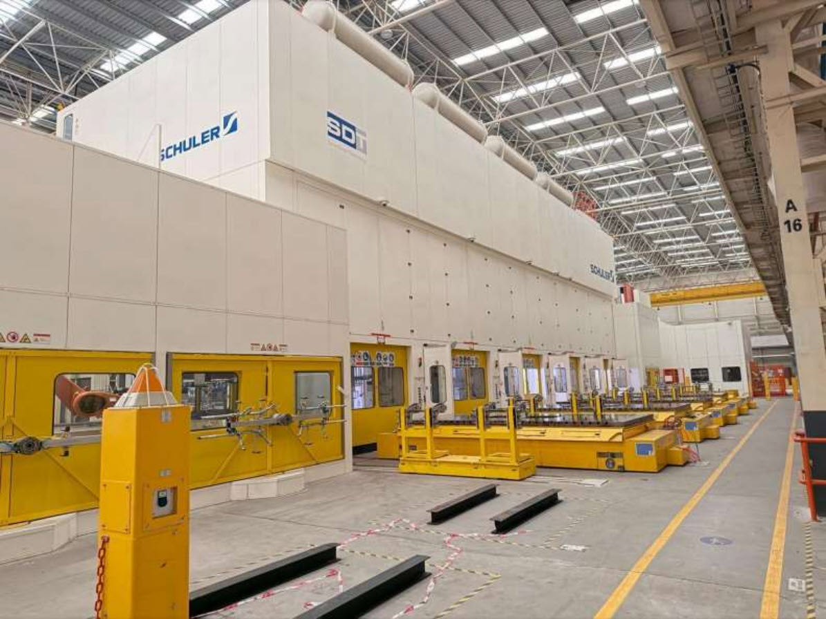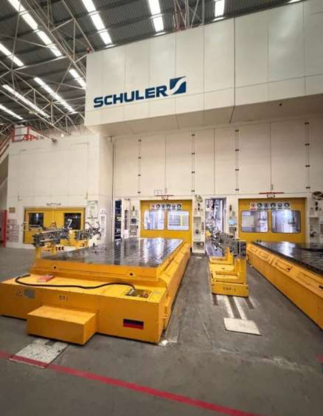 | PRESS 1 | 2,755 TON SCHULER PRESS MODEL: SSL4-2500-5.0X2.5-1300 | CAPACITY | 2,755 TONS / 25,000 KN | STROKE | 51.18" / 1300 MM | DIE MOUNTING HEIGHT (SDAU) | 42.13" TO 63" / 1070 MM TO 1600 MM | BED AREA | 196.85" X 98.43" (RL X FB) / 5000 X 2500 MM | RAM / SLIDE AREA | 196.85" X 98.43" (RL X FB) / 5000 X 2500 MM | DISTANCE BETWEEN UPRIGHTS | 200.79" X 104.33" (RL X FB) / 5100 X 2650 MM | SPEEDS | 3-17 SPM | CUSHION CAPACITY | 550 TONS / 5000 KN | CUSHION STROKE | .79" TO 13.78" / 20 - 350 MM | MAIN ELECTRIC MOTORS | (4) 523 HP MOTORS / 390 KW | TOTAL WEIGHT | 1,565,282 LBS / 710,000 KG | PRESSES 2, 3, 4, 5 | 1,323 TON SCHULER PRESS MODEL SSL4-1200-5.0x2.5-1300 | CAPACITY | 1,323 TONS / 12,000 KN | STROKE | 51.18" / 1300 MM | DIE MOUNTING HEIGHT (SDAU) | 42.13" TO 63" / 1070 TO 1600 MM | BED AREA | 196.85" X 98.43" (RL X FB) / 5000 X 2500 MM | RAM / SLIDE AREA | 196.85" X 98.43" (RL X FB) / 5000 X 2500 MM | DISTANCE BETWEEN UPRIGHTS | 200.79" X 104.33" (RL X FB) / 5100 X 2650 MM | SPEEDS | 3-17 SPM | MAIN ELECTRIC MOTORS | (2) 523 HP MOTORS / 390 KW | TOTAL WEIGHT | 903,895 LBS / 410,000 KG | Equipped With | Schuler "ServoDirect" Technology: Fully programmable slide curves (Pendulum mode, Link motion simulation, etc.) for optimized forming speeds, 4-Point Hydraulic Drawing Cushion, Rolling Bolster System, Hydraulic Overload Protection, Automatic Ram Adjustment & Clamping, Automatic Counterbalance System | Note | fully programmable stroke profiles. The 2755-ton lead press includes a 4-point hydraulic cushion, ideal for large automotive or appliance panels. |