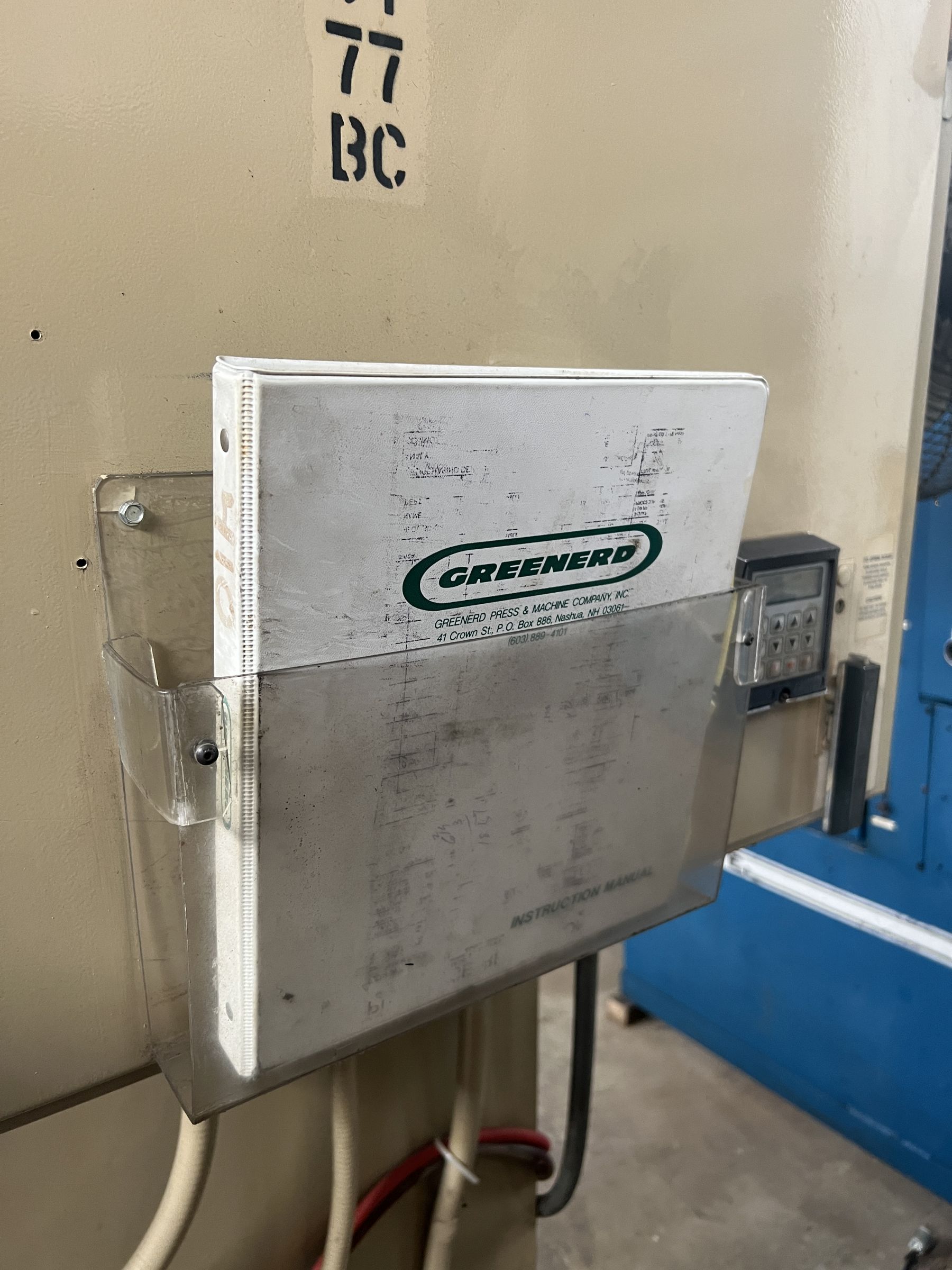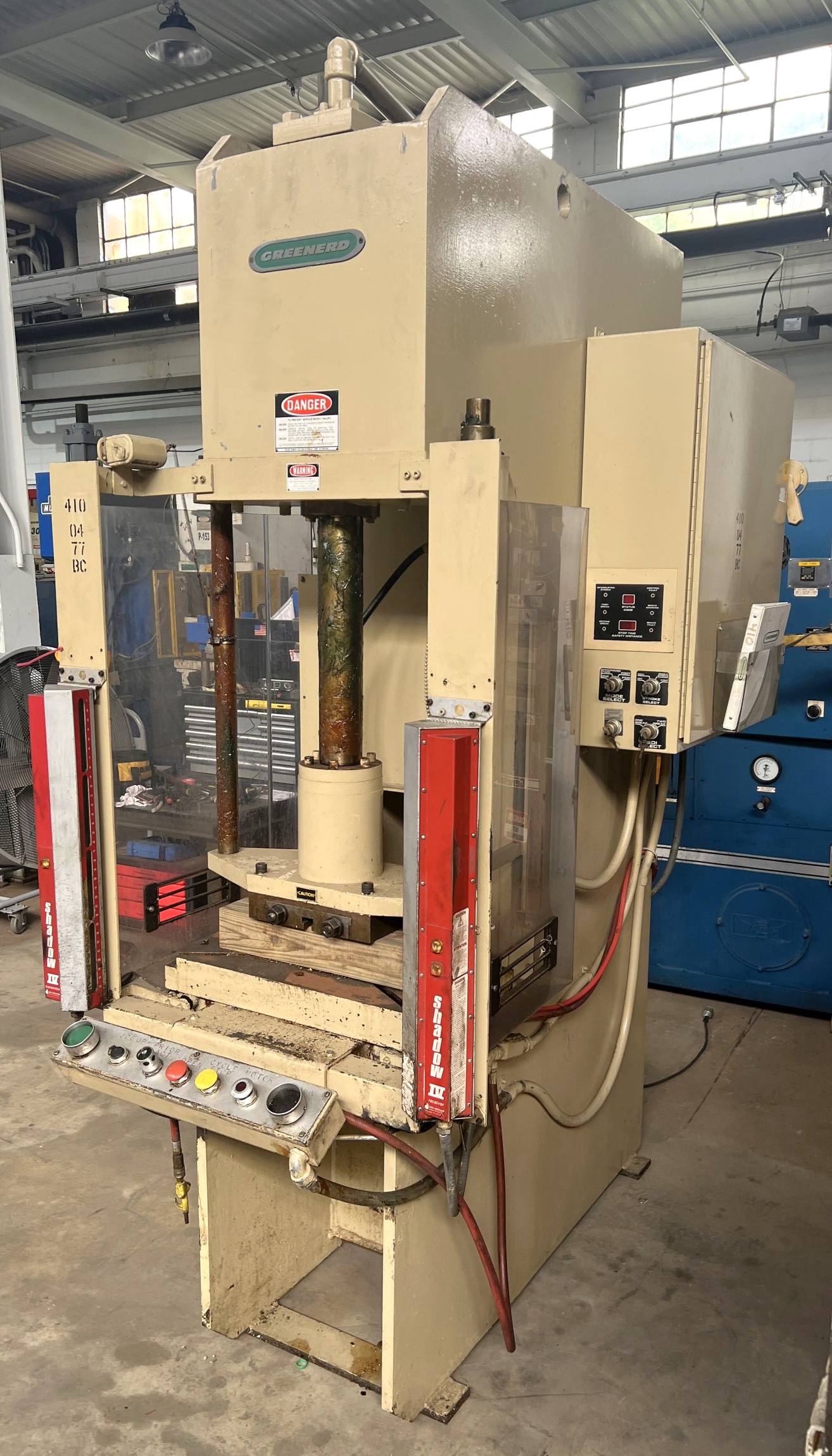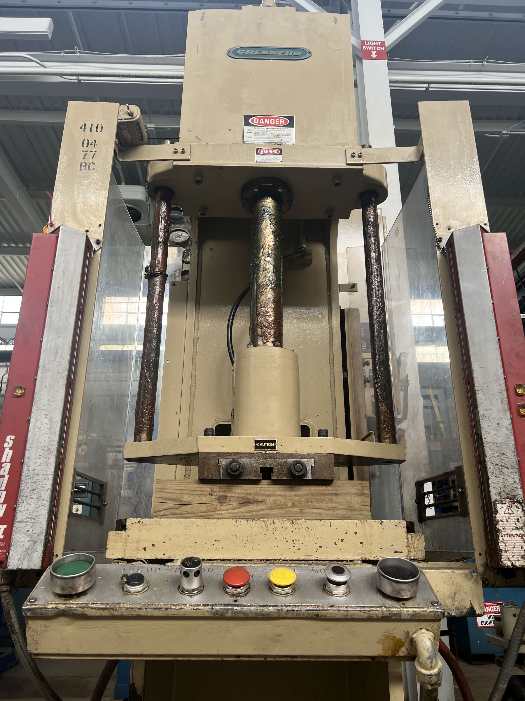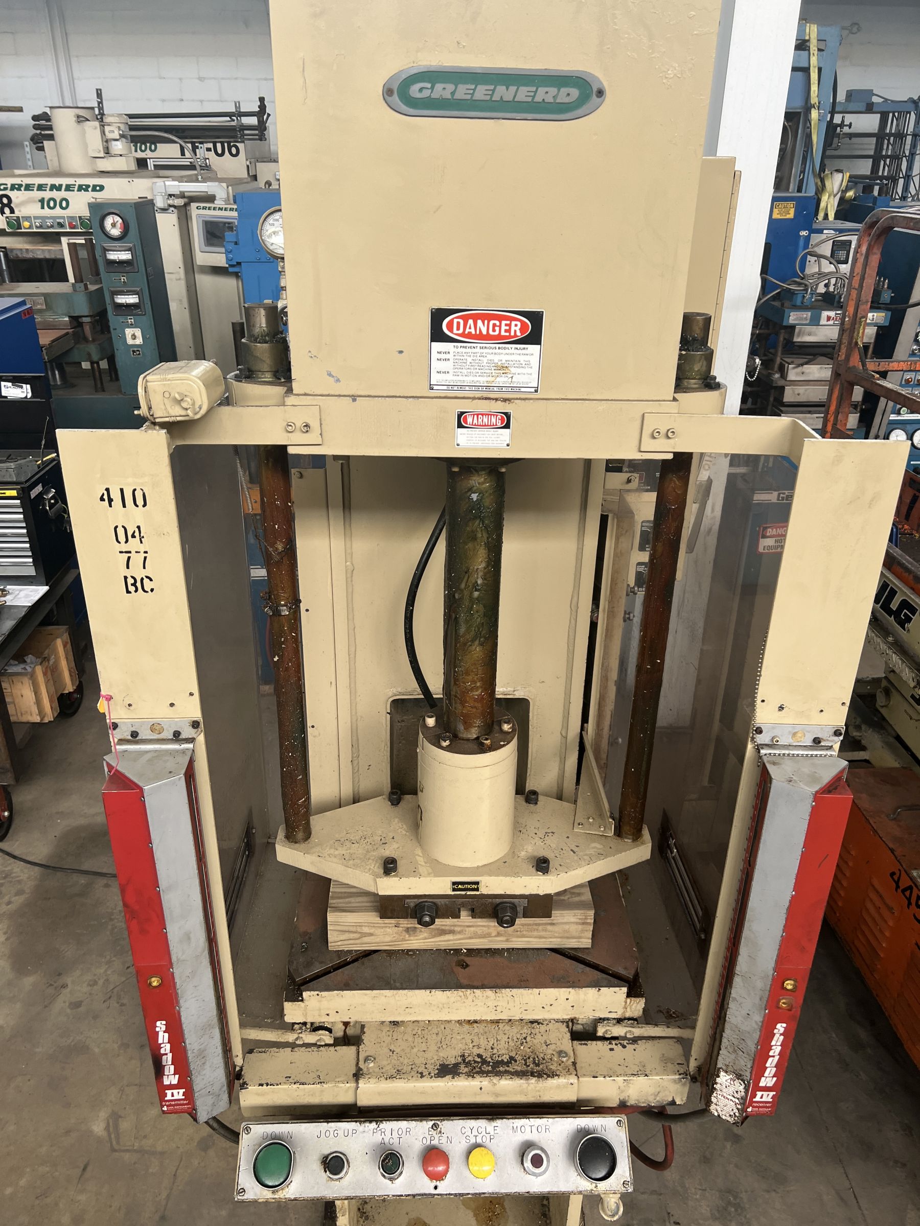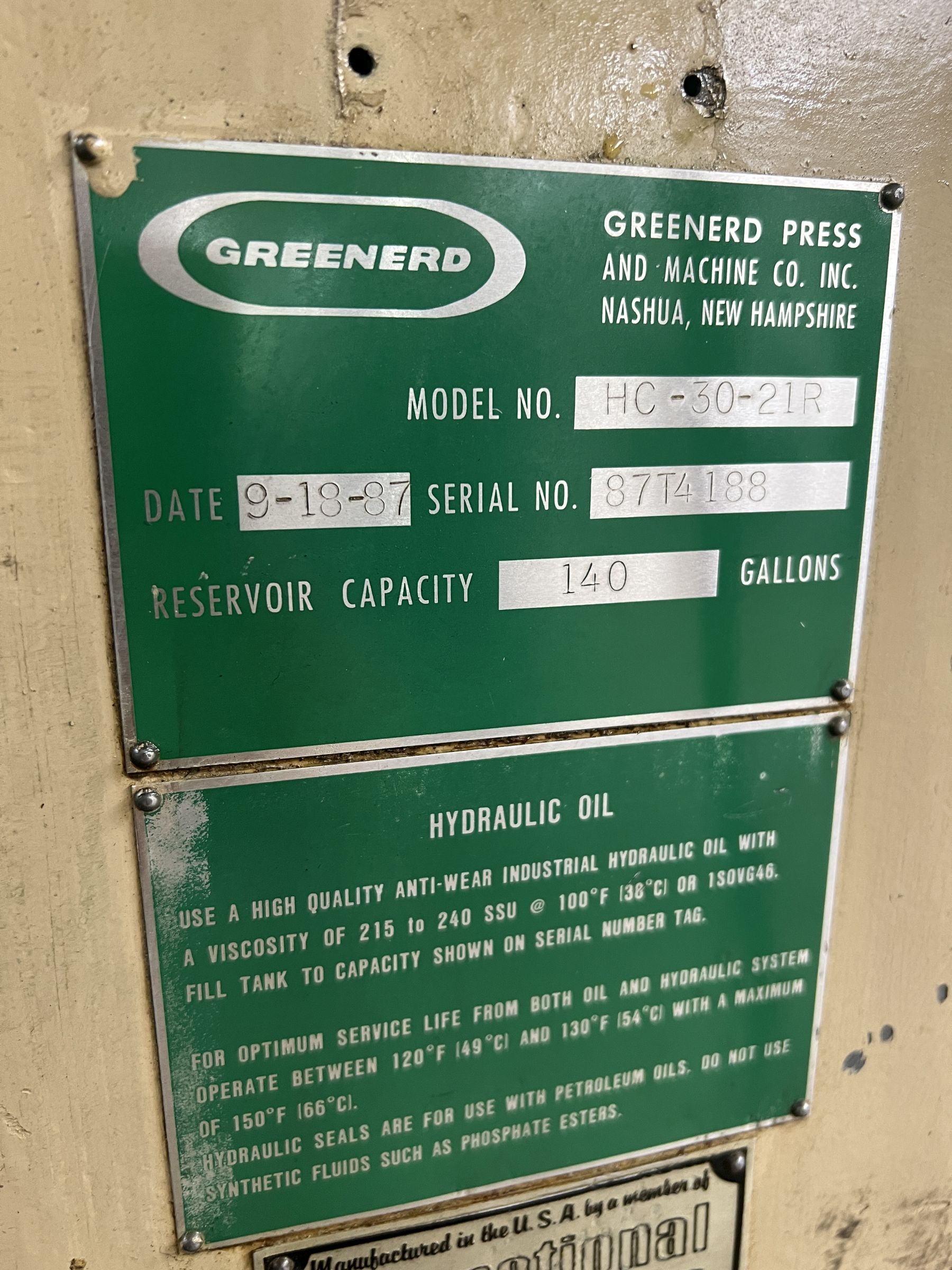 | MAX. CAPACITY | 30 TONS | STROKE | Approx. 16" | MAX. DAYLIGHT | Approx. 27" | BED AREA | 18" x 15" (LR X FB) | BOLSTER PLATE | 25" X 15" (LR X FB) 3" ThICK | RAM PLATE AREA | 27" X 9" (LR X FB) | RAM ROD SIZE | APPROX. 3.5" DIA. | CYLINDER SIZE | 5" DIA. BORE | THROAT DEPTH | 11" | FLOOR TO BED HEIGHT | 34" | SPEEDS (IPM) | 504 CLOSING / 247 PRESSING / 484 OPENING | PRESS CONTROLS | GREENERD PP HYDRAULIC V7.0 CONTROLLER | HYDRAULICS | VICKERS HYDRAULIC PUMP MODEL 2520VQ14A5-1AA20 | ELECTRIC MOTOR | 40 HP MOTOR | APPROX. DIMENSIONS | 44" x 84" (LR X FB) 108" HIGH | APPROX. WEIGHT | 5200 | Equipped With | 12" x 9" Ram Plate w/ T slotted Die Block, 2.25" THick | Note | __ |