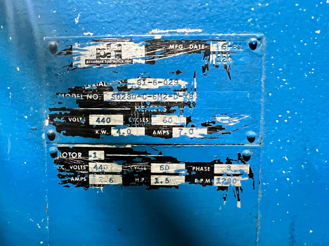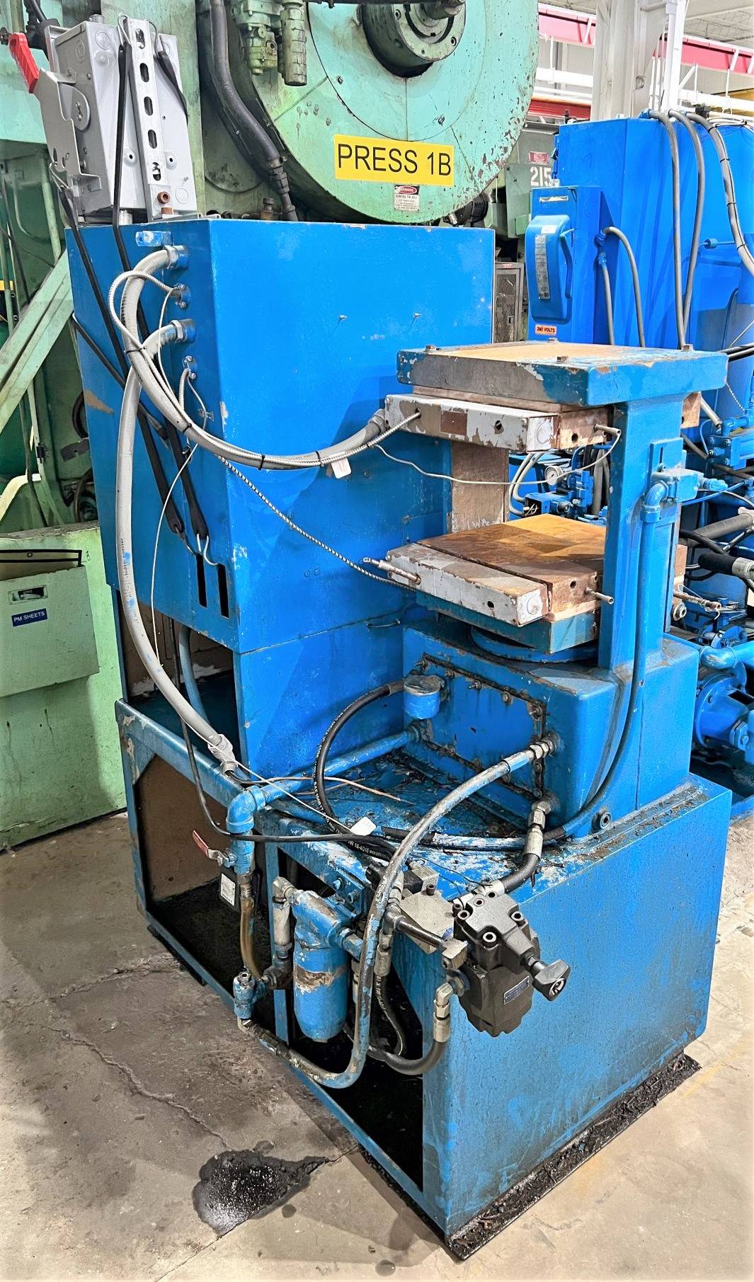 | CAPACITY | 30 TONS AT 3,000 PSI | STROKE | 8" | MAX. DAYLIGHT | 12.5" | ELECTRIC HEATED PLATENS | 12.5" X 12.5" (RL X FB) X 2.25" THICK | DISTANCE BETWEEN FRAME | 13.25" | RAM ROD SIZE | 3.5" DIA. | CYLINDER SIZE | 5" DIA. BORE | 2 COLUMN / POSTS SIZE | 1" X 5" FRAME | FLOOR TO BED HEIGHT | 37.25" | PRESS CONTROLS | ALLEN-BRADLEY RELAY LOGIC CONTROLLER, 7 AMPS ELECTRICAL HEATERS | HYDRAULICS | __ | ELECTRIC INDUSTRIAL MOTOR | 1.5 HP 440V-3-60 MOTOR | 2.6 AMPS | APPROX. DIMENSIONS | 57" X 36" (RL X FB) X 74" HIGH | APPROX. WEIGHT | __ | Equipped With | __ | Note | __ |