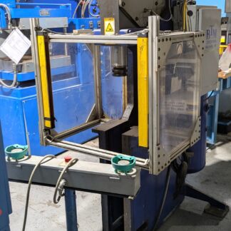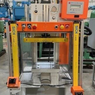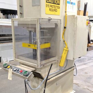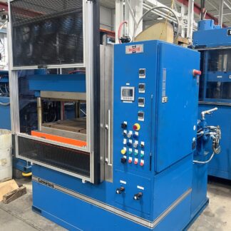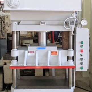 | CAPACITY | 30 TONS @ 3000 PSI | MAX. STROKE | 6″ UP ACTING STROKE | MAX. DAYLIGHT | 20″ | OVERALL BED & RAM AREA | 21″ X 15″ (RL X FB) | DISTANCE BETWEEN POSTS | 17.25″ X 7.75″ (RL X FB) | SPEEDS | TBD | USABLE BED AREA | 17.25″ X 15″ (RL X FB) | HEATED PLATEN SIZE | 15″ X 15″ (RL X FB) 4 PLATENS, 2 OPENINGS (platens are not guaranteed) | — | PLATENS HEAT UP TO AT LEAST 175 DEG. CELSIUS (347 DEG F) | CYLINDER SIZE | 5″ DIA. | POSTS SIZE | 1″ DIA. | HYDRAULICS | 90 GALLON CAPACITY MOBIL DTE-26 OIL 25 GPM / 12 GPM | ELECTRICS | 15 HP MOTOR 1800 RPM OMRON TIMER | CONTROLS | ALLEN BRADLEY SLC 500 PLC PROGRAMMABLE CONTROLLER / WEST PRO-EC44 CONTROLS | APPROX. DIMENSIONS | 43″ X 44″ (RL X FB) X 76″ | APPROX. WEIGHT | APPROX. 5,000 LBS. | Equipped With | __ | Note | NEW WEST PRO-EC44 CONTROLS UPDATED IN 2015 |