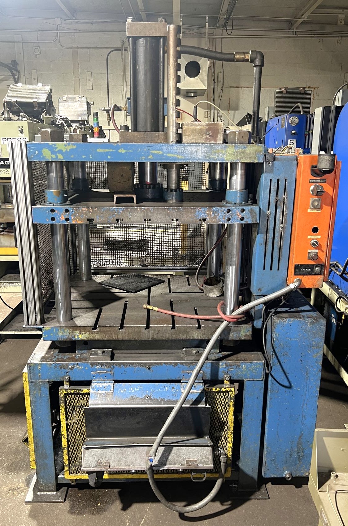 | MAX. CAPACITY | APPROX. 35 TONS | MAX. STROKE | 14" | MAX. DAYLIGHT | 22" | OVERALL BED & RAM AREA | 40" X 34.25" (RL X FB) | DISTANCE BETWEEN POSTS | 30" X 24" (RL X FB) | USABLE BED AREA | 30" X 34.25" (RL X FB) | FLOOR TO BED HEIGHT | 38" | SPEEDS | __ | RAM ROD SIZE | 4" DIA. | CYLINDER SIZE | 6" DIA. BORE | POSTS / 4 COLUMN SIZE | 3" DIA. | PRESS CONTROLS | ALLEN-BRADLEY MICROLOGIX 1200 CONTROLLER | HYDRAULICS | HANNA CYLINDER MODEL ML52HNC | ELECTRIC MOTOR | MOUNTED IN BASE FOR OPTIMAL SMALL FOOTPRINT | APPROX. DIMENSIONS | 68" X 64" (RL X FB) X 99" HIGH | APPROX. WEIGHT | __ | Equipped With | __ | Note | __ |