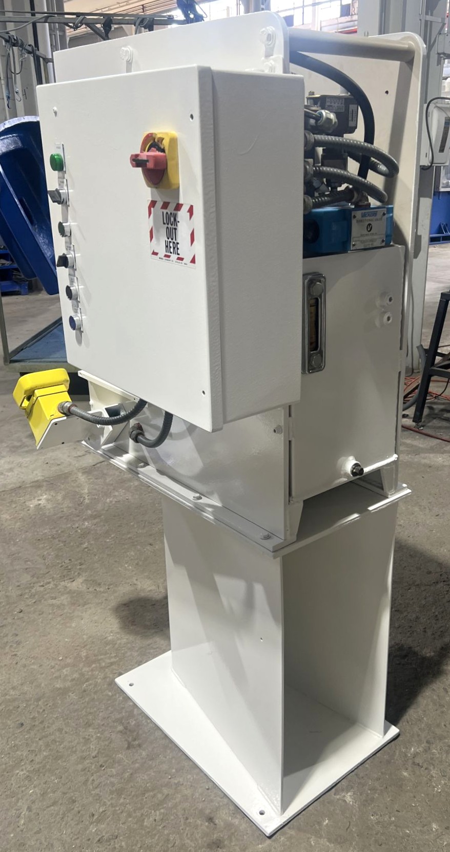 | MAX. CAPaCITY | 5 TONS AT 2,040 PSI | Max. stroke | 6" | max daylight | 12" | Bed area | 14" x 12 (rl x FB) | Ram Area | 10.5" x 4" (RL x fb) | Throat Depth | 6.5" | Floor to Bed Height | 36.75" (8.5" ACTUAL + 28.25" RISER BASE) | Cylinder Size | 2.5" dia. Bore | Ram Rod size | 1.38" DIA. | PRESS CONTROLS | MITSUBISHI MELSEC FX1s-20mr micro pc CONTROLLER | Electric Motor | 3 HP 220/440V-3-60 LEESON MOTOR | 9.6 / 4.8 AMPS | Hydraulics | 12 GALLON RESERVOIR, PARKER FLUIDPOWER CYLINDER | Approx. Dimensions | 34" x 36" (RL x FB) x 64" high (INCLUDING 28.25" RISER BASE) | Approx. Weight | APPROX. 850 LBS. | Equipped With | __ | Note | __ |