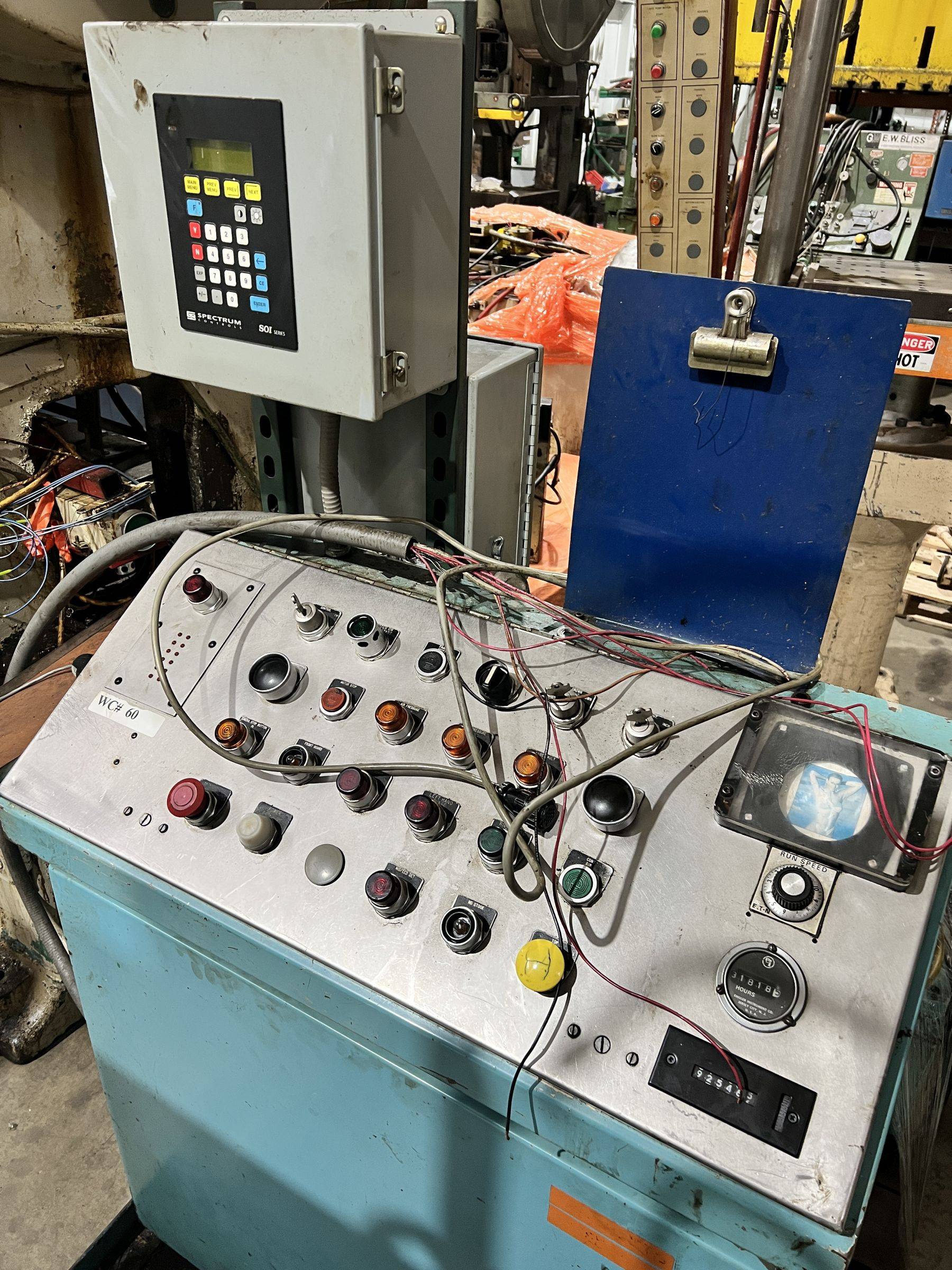 | CAPACITY | 60 TONS | STROKE | 2" | MAX. SHUT HEIGHT TO BED | 16" | BED AREA | 53.5" X 19.5" (RL X FB) | BOLSTER PLATE | 53.5" X 19.5" (RL X FB) X 4" THICK T-SLOTTED BOLSTER PLATE | DISTANCE BETWEEN UPRIGHTS | 42.5" | RAM AREA | 42" X 20" (RL X FB) | RAM ADJUSTMENT | 3" | SPEED | 133 TO 400 STROKES PER MINUTE | FLOOR TO BED HEIGHT | 39.25" | WINDOW SIZE | 20.5" WIDE X 13" HIGH | PRESS CONTROLS | ALLEN-BRADLEY RELAY LOGIC CONTROLLER | AIR CLUTCH | OAK AIR CLUTCH & BRAKE ASSEMBLY | ELECTRICAL | 15 HP 230/460V-3-60 EATON DYNAMATIC AJUSTO SPEDE MOTOR | 43/21.5 AMPS | APPROX. DIMENSIONS | 103" X 55" (RL X FB) X 120" HIGH | APPROX. WEIGHT | 12,500 LBS. | Equipped With | tie rod steel frame construction, flywheel type drive | Note | __ |