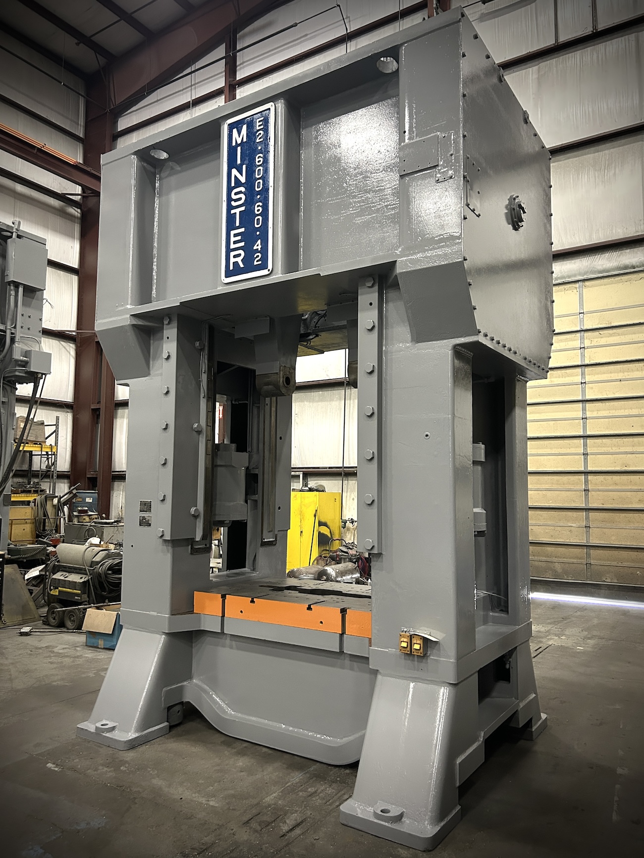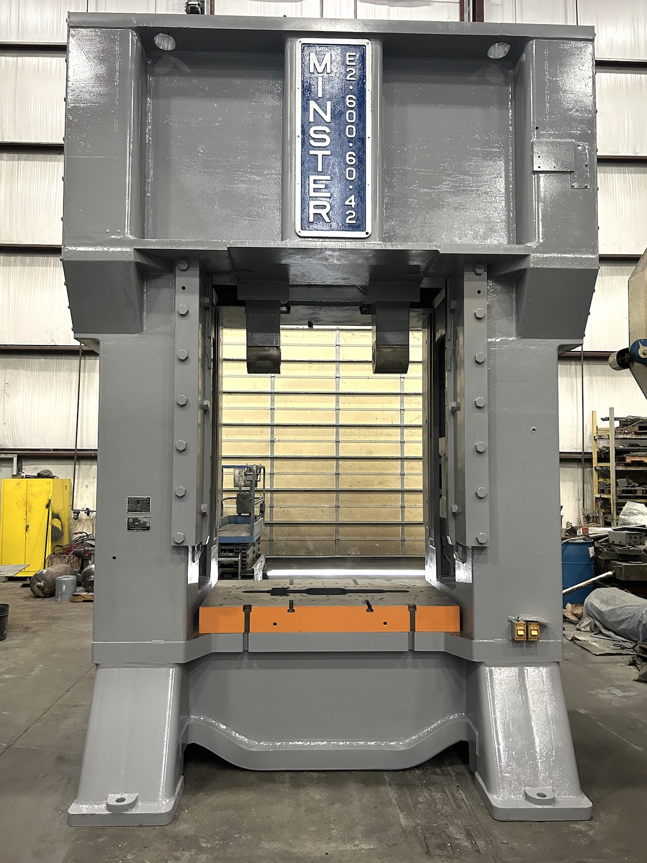 | CAPACITY | 600 ton | STROKE | 4" | MAX SHUT HEIGHT TO BED | 34" sdau | BED AREA | 60" x 42" (rl x fb) | SPEED | 25 spm | SLIDE ADJUSTMENT | 12" motorized | SLIDE AREA | 60" rl x 42" fb | BOLSTER PLATE | 6.5" h x 60" rl x 42" fb | DISTANCE BETWEEN UPRIGHTS | 60" | DISTANCE FLOOR TO BED | 36" | WINDOW SIZE | 25" W | CLUTCH | minster air clutch / brake combination | ELECTRICS | 50 hp 1150 rpm 480v-3-60 motor & control | APPROX DIMENSIONS | 238" h x 109" rl x 87" fb | APPROX WEIGHT | 120,000 lbs | Equipped With | TIE ROD FRAME, GEARED, TWIN END DRIVE, HEAVY DUTY UPRIGHTS, EIGHT POINT GIBBING FOR PRECISION SLIDE GUIDING, HEAVY SLIDE & CONNECTIONS, DUAL AIR COUNTERBALANCES, FLOOR STANDING | Note | __ |