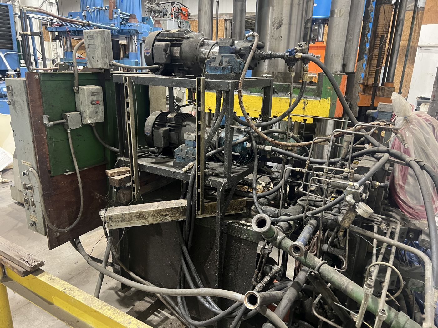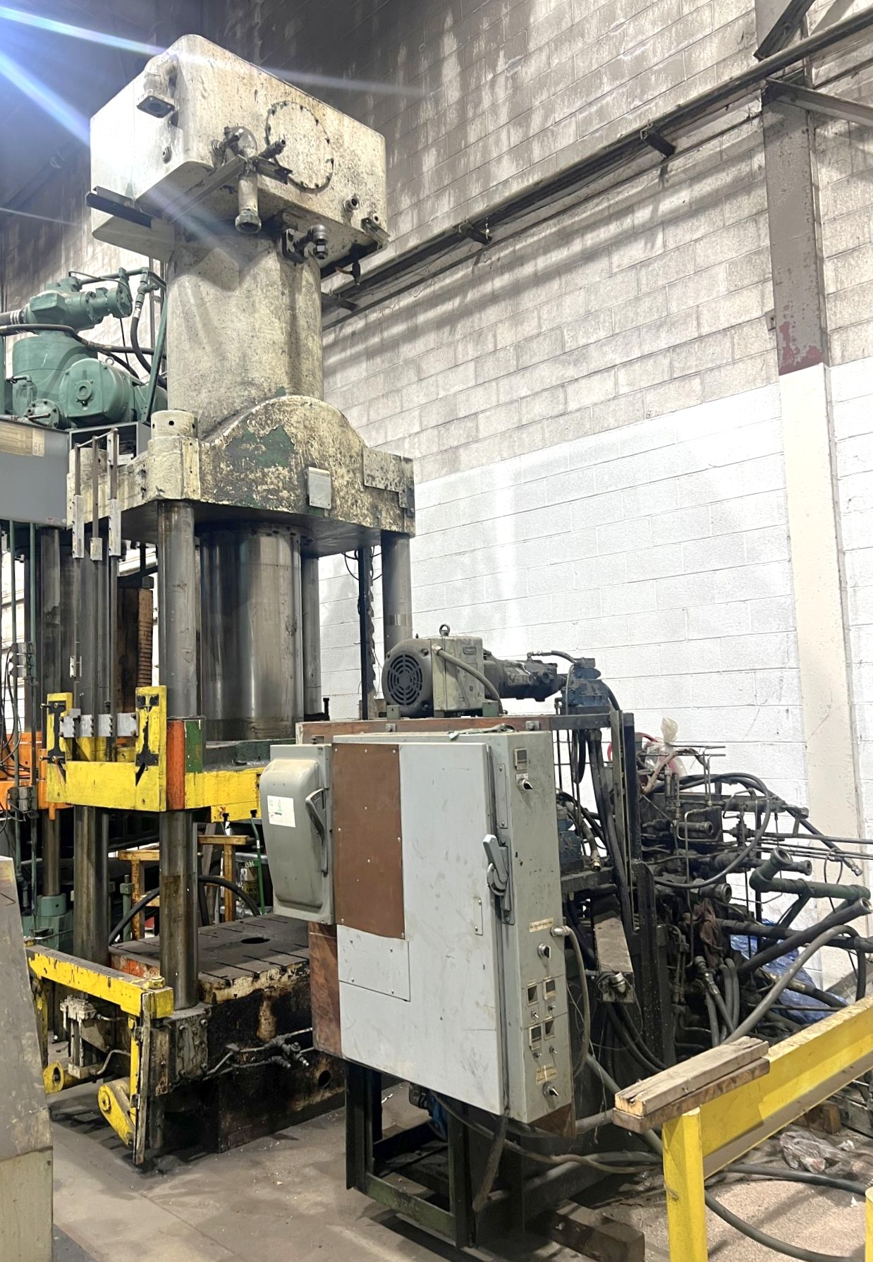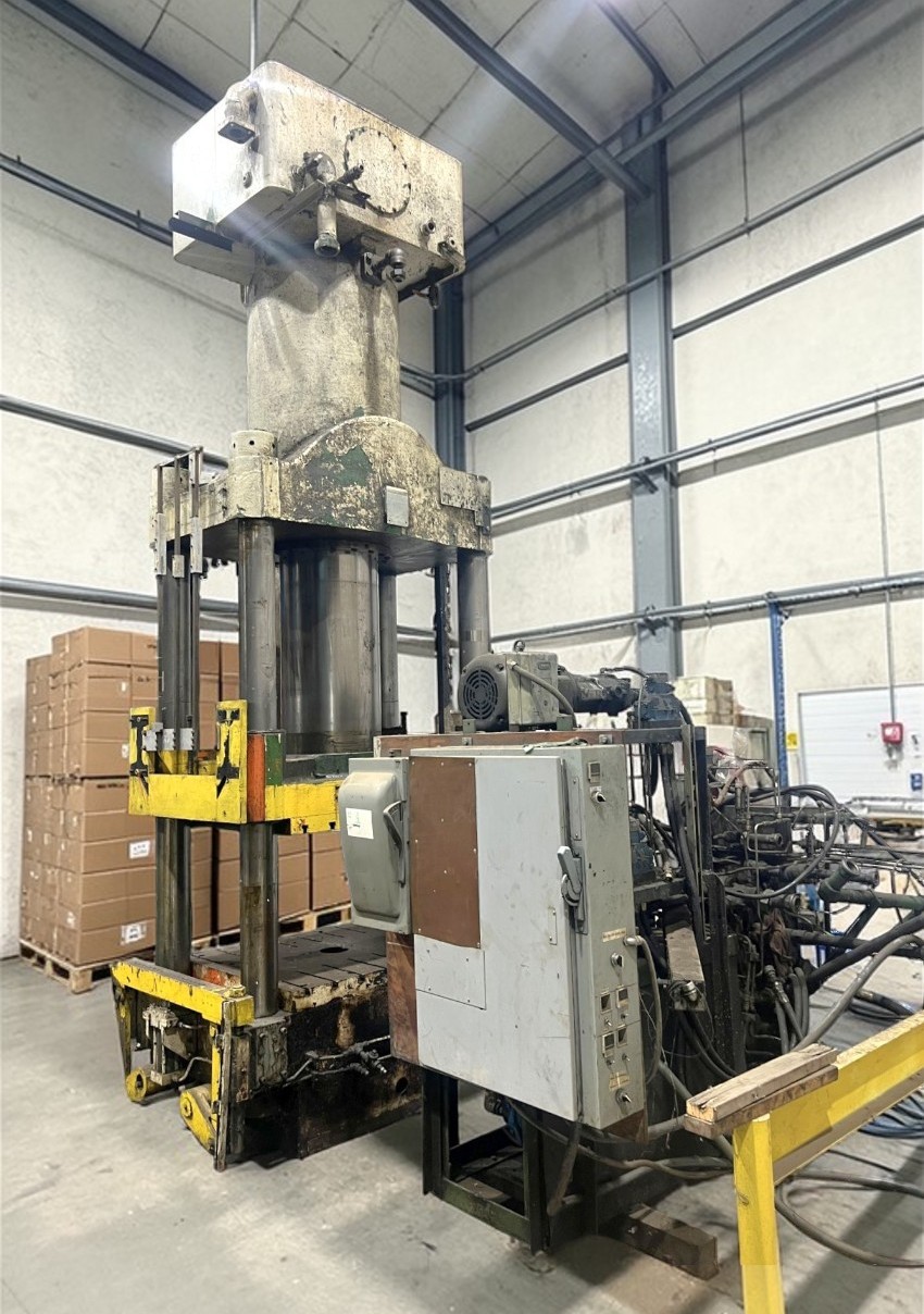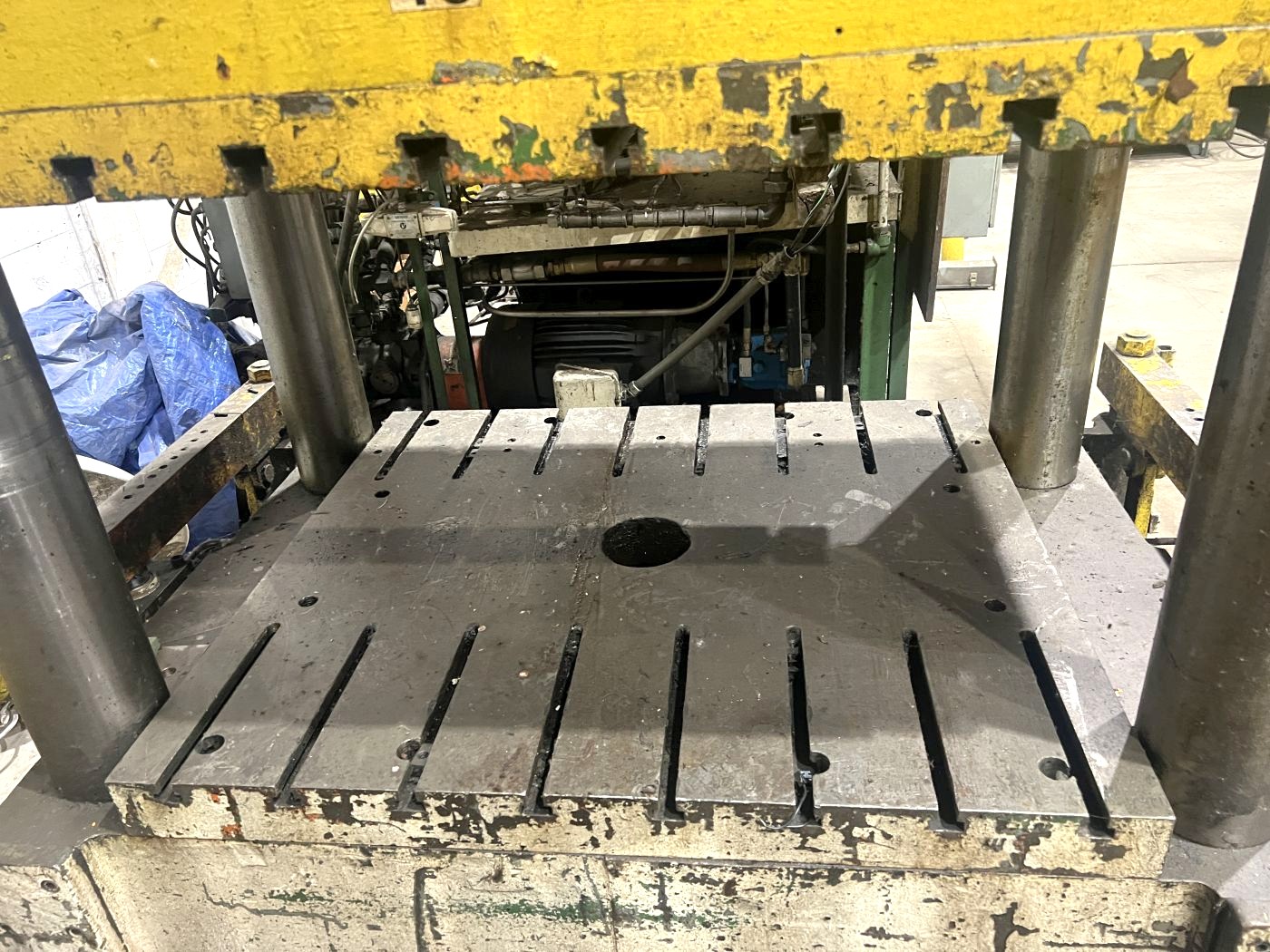| CAPACITY | 600 TON @ 3,175 PSI | MAX. STROKE | 36" | MAX. DAYLIGHT TO BED | 71" | DISTANCE BETWEEN POSTS | 48.5" X 22" (RL X FB) *APPROX. | USABLE BED & RAM AREA | 48" X 42" (RL X FB) t-sLOTTED RAM & BED | POST SIZE | 6-1/2" DIA. | DISTANCE FLOOR TO BED | 24" | ROD SIZE | 21" DIA. | MAIN CYLINDER SIZE | 22" DIA. BORE | PRESS CONTROLS | RELAY LOGIC CONTROLS, NEW UPGRADED CONTROLS AVAILABLE FOR MINIMAL COST | HYDRAULIC SYSTEM | VICKERS PUMP PVH57QIC-LF-1S-10 MODEL C25-31 | PVB 20 RS 20 C 11 | PVB20 RS 20 0M 11 | HYDRAULIC SYSTEM (CONT) | 60 GPM RACINE & 24 GPM DELAVAN PISTON PUMPS | ELECTRIC MOTOR 1 | 40 HP 230/460V-3-60 STERLING MOTOR | 99 / 49.5 AMPS | ELECTRIC MOTOR 2 | 15 HP 230/460V-3-60 BALDOR INDUSTRIAL MOTOR | 38 / 19 AMPS | ELECTRIC MOTOR 3 | 15 HP 230/460V-3-60 BALDOR INDUSTRIAL MOTOR | 38 / 19 AMPS | OVERALL DIMENSIONS | 96" X 60" (RL X FB) X 208" HIGH | APPROX. WEIGHT | 60,000 LBS. | Equipped With | LOWER SIDE KNOCKOUT CYLINDERS 6" STROKE, FLOOR STANDING DESIGN, HEATER CONTROLLER (AS-IS), THERMAL TRANSFER PRODUCTS HEAT EXCHANGER MODEL B-1003-B4-F (250 PSI, 350 DEG F) | Note | POTENTIALLY ADDITIONAL COST IF CYLINDER REQUIRES MAJOR REPAIRS (DEPOSIT REFUNDABLE) |