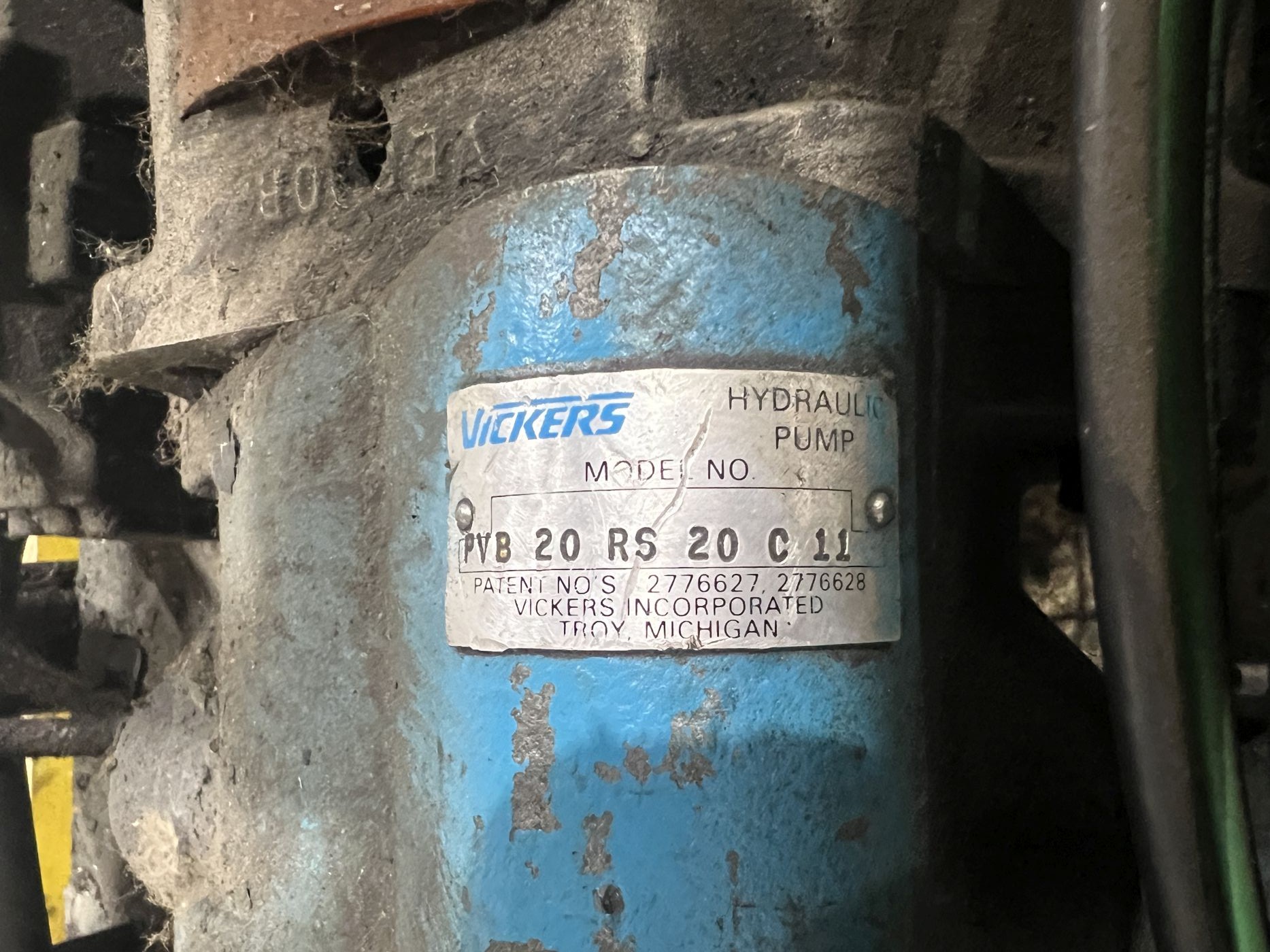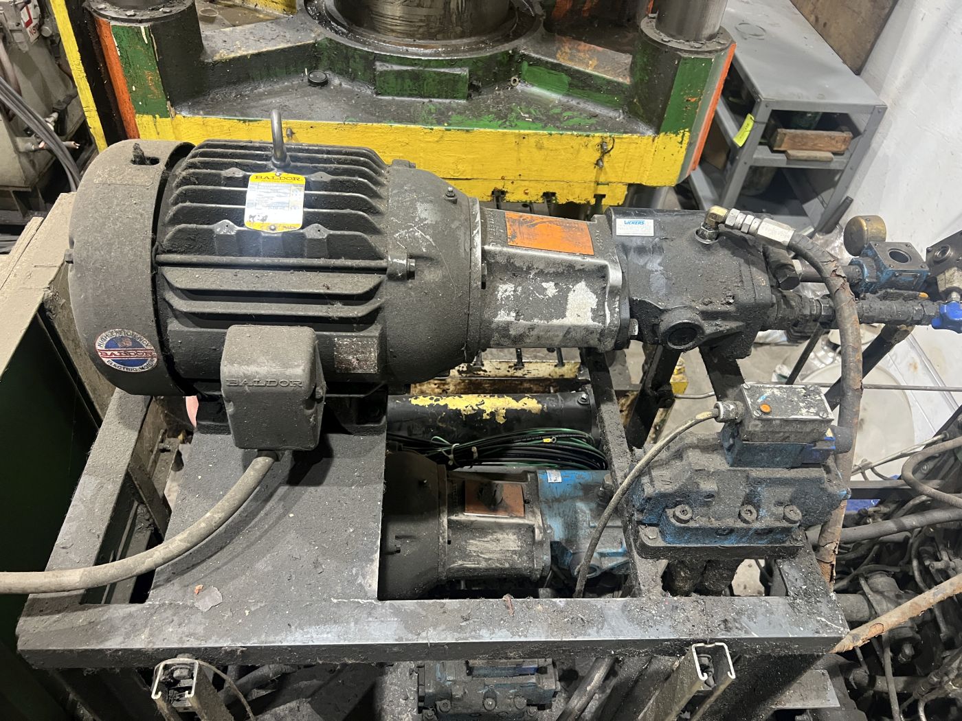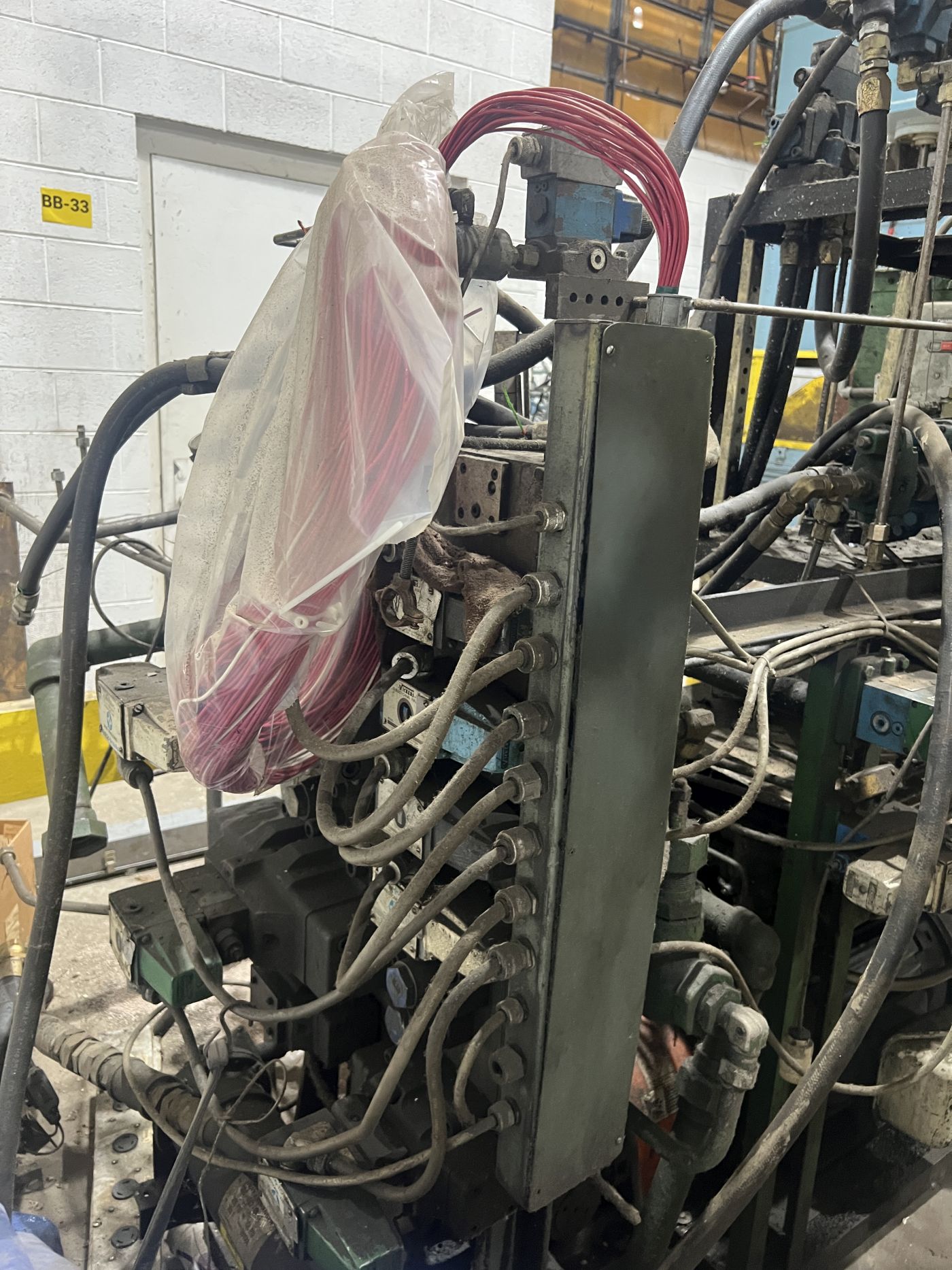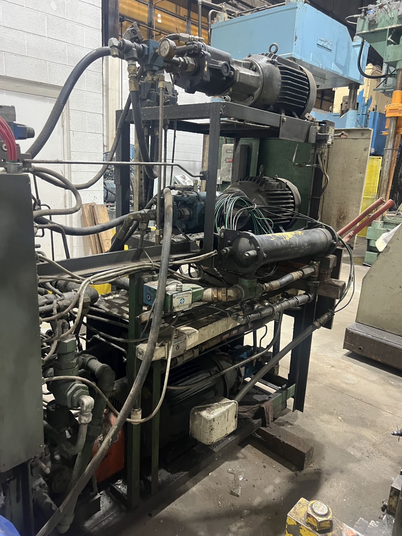 | CAPACITY | 600 TON @ 3,175 PSI | MAX. STROKE | 36" | MAX. DAYLIGHT TO BED | 71" | DISTANCE BETWEEN POSTS | 48.5" X 22" (RL X FB) *APPROX. | USABLE BED & RAM AREA | 48" X 42" (RL X FB) t-sLOTTED RAM & BED | POST SIZE | 6-1/2" DIA. | DISTANCE FLOOR TO BED | 24" | ROD SIZE | 21" DIA. | MAIN CYLINDER SIZE | 22" DIA. BORE | PRESS CONTROLS | RELAY LOGIC CONTROLS, NEW UPGRADED CONTROLS AVAILABLE FOR MINIMAL COST | HYDRAULIC SYSTEM | VICKERS PUMP PVH57QIC-LF-1S-10 MODEL C25-31 | PVB 20 RS 20 C 11 | PVB20 RS 20 0M 11 | HYDRAULIC SYSTEM (CONT) | 60 GPM RACINE & 24 GPM DELAVAN PISTON PUMPS | ELECTRIC MOTOR 1 | 40 HP 230/460V-3-60 STERLING MOTOR | 99 / 49.5 AMPS | ELECTRIC MOTOR 2 | 15 HP 230/460V-3-60 BALDOR INDUSTRIAL MOTOR | 38 / 19 AMPS | ELECTRIC MOTOR 3 | 15 HP 230/460V-3-60 BALDOR INDUSTRIAL MOTOR | 38 / 19 AMPS | OVERALL DIMENSIONS | 96" X 60" (RL X FB) X 208" HIGH | APPROX. WEIGHT | 60,000 LBS. | Equipped With | LOWER SIDE KNOCKOUT CYLINDERS 6" STROKE, FLOOR STANDING DESIGN, HEATER CONTROLLER (AS-IS), THERMAL TRANSFER PRODUCTS HEAT EXCHANGER MODEL B-1003-B4-F (250 PSI, 350 DEG F) | Note | POTENTIALLY ADDITIONAL COST IF CYLINDER REQUIRES MAJOR REPAIRS (DEPOSIT REFUNDABLE) |