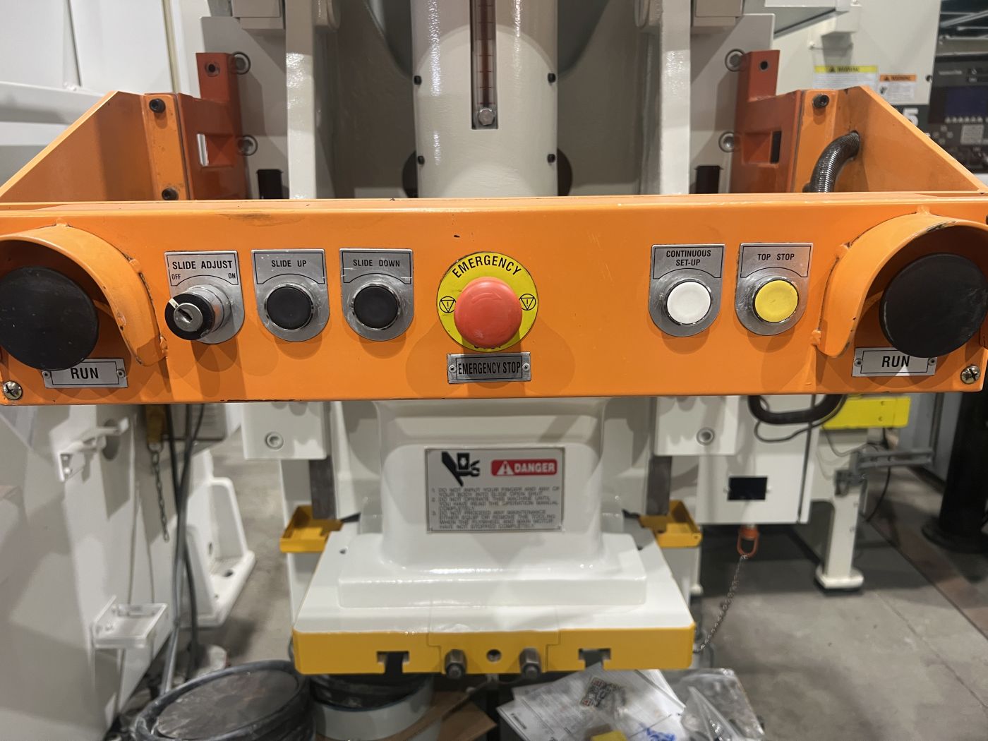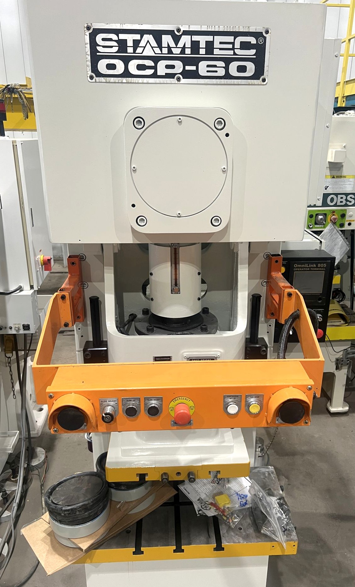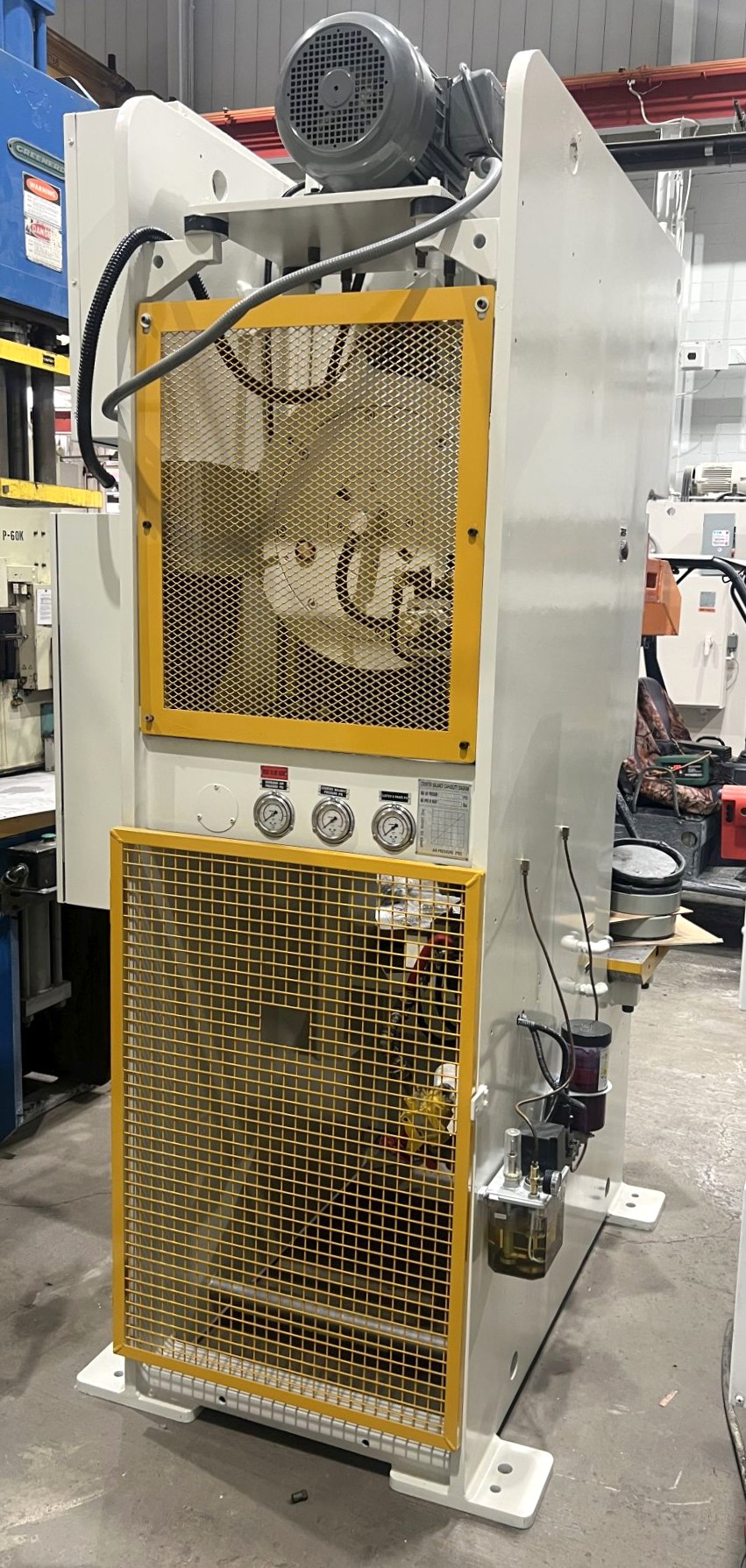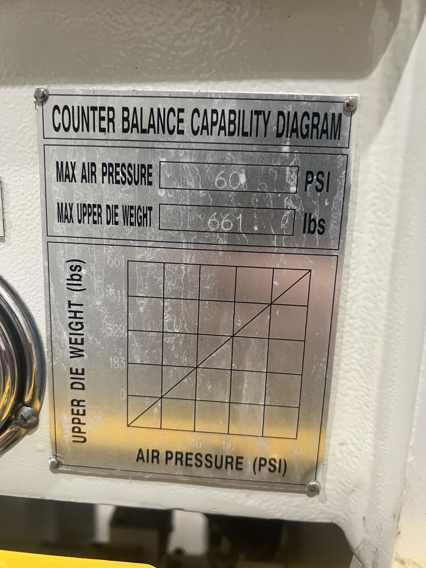 | CAPACITY | 66 US TONS | STROKE | APPROX. 3.55" | max die height | APPROX. 10.64" sdau over bolster | BED AREA | 35.5" X 15.8" (RL X FB) | SLIDE AREA | 19.7" X 15.8" (RL X FB) (t-slot) | slide ADJUSTMENT | APPROX. 2.76" motorized | SPEED | APPROX. 60 - 120 SPM | BOLSTER PLATE | 35.5" X 15.8" x 3.5" (RL X FB x h) (t-slot) | DISTANCE BETWEEN UPRIGHTS | 21" | FLOOR TO BED HEIGHT | 32.5" | AIR CLUTCH | STAMTEC AIR CLUTCH AND BRAKE ASSEMBLY | PRESS CONTROLS | OMNILINK 805 LINK CONTROLLER MODEL 5100 | ELECTRIC MOTOR | 10 HP 480V-3-60 MOTOR | 25 AMPS | DIMENSIONS | 48" x 72" (rl x fb) x 110" High | WEIGHT | 9,800 lbs | Equipped With | HYDRAULIC OVERLOAD PROTECTION, LOW DEFLECTION, SUPER RIGID STEEL FRAME, EXTRA LONG 6 PT CENTERED GIBS, REMOVABLE BOLSTER & SLIDE PLATE, AUTOMATIC LUBRICATION SYSTEM, DUAL AIR COUNTERBALANCES, SINGLE BACK GEARED DESIGN, FLOOR STANDING | Note | 60 PSI MAX. AIR PRESSURE 661 LBS. MAX. UPPER DIE WEIGHT |