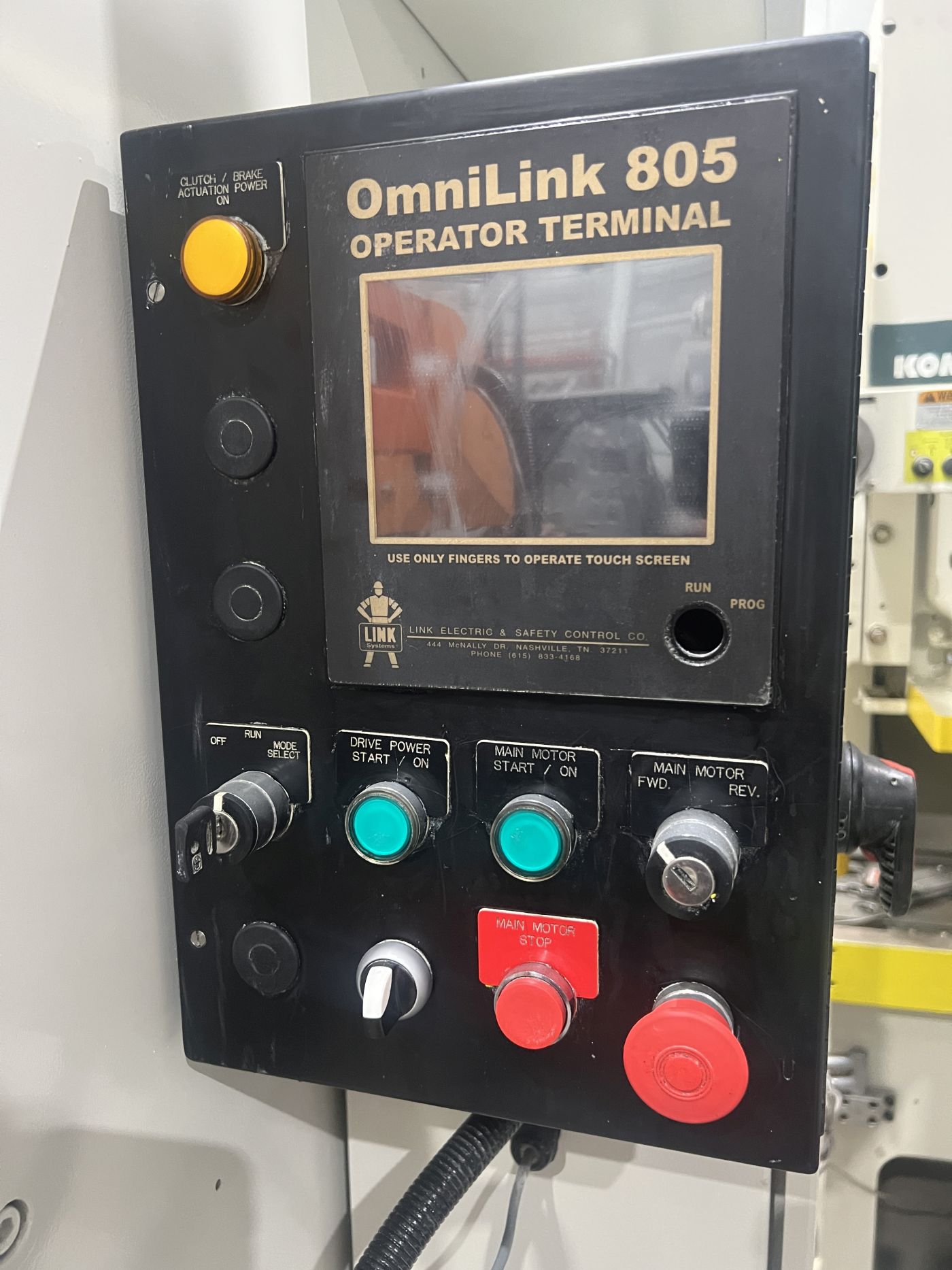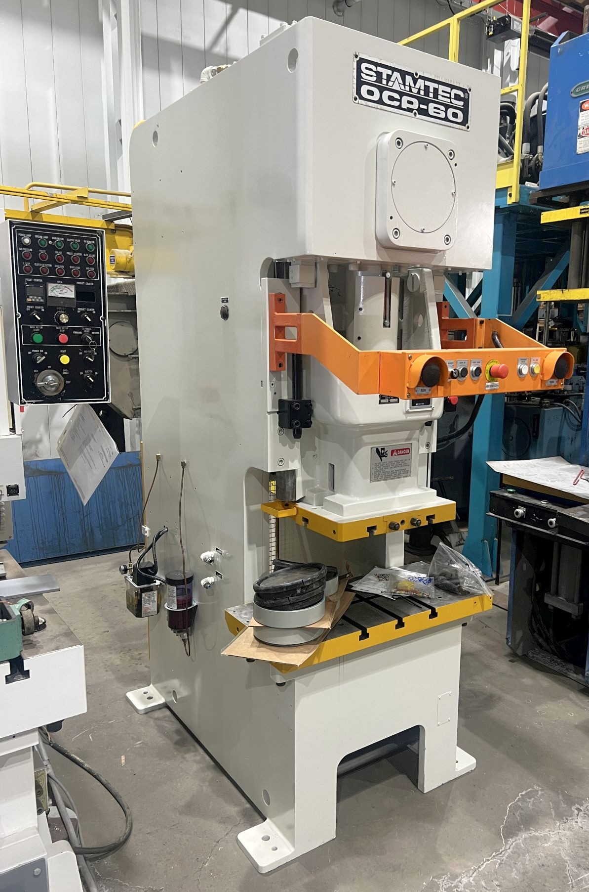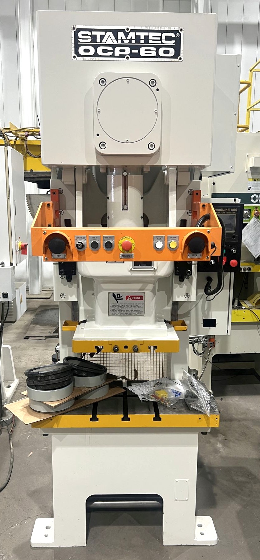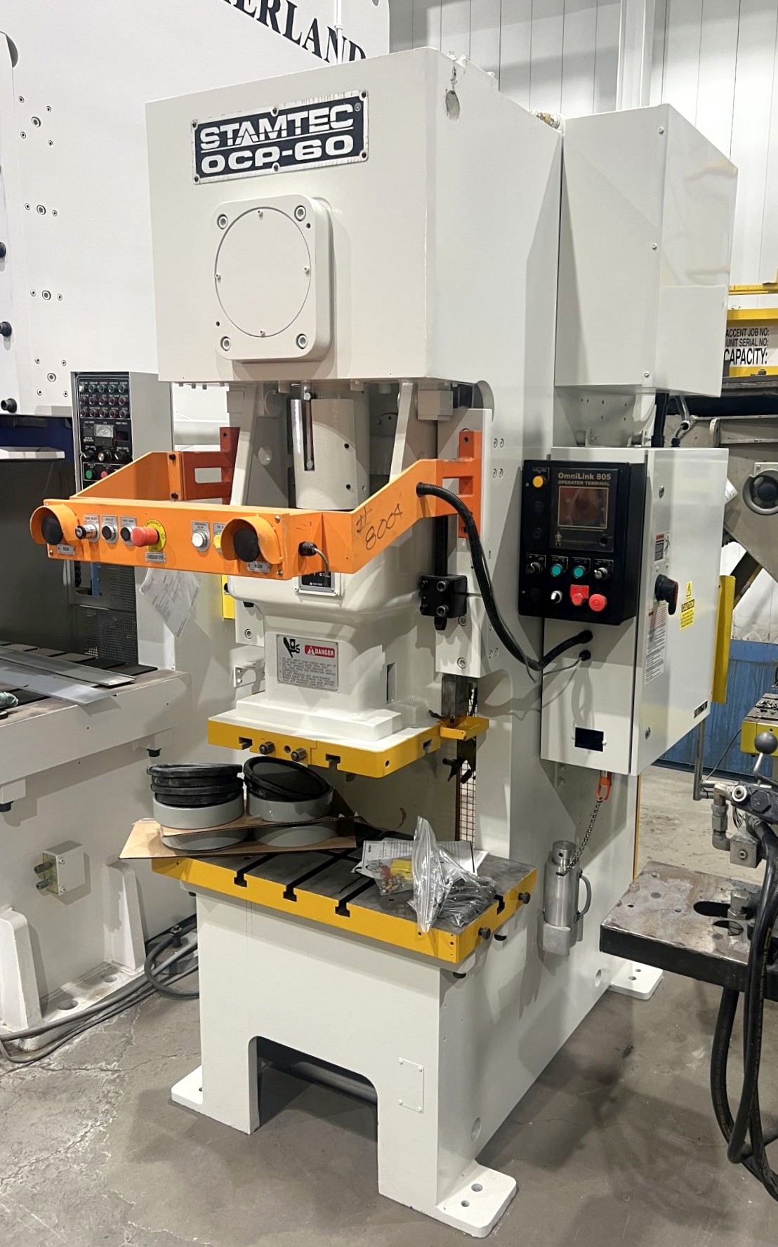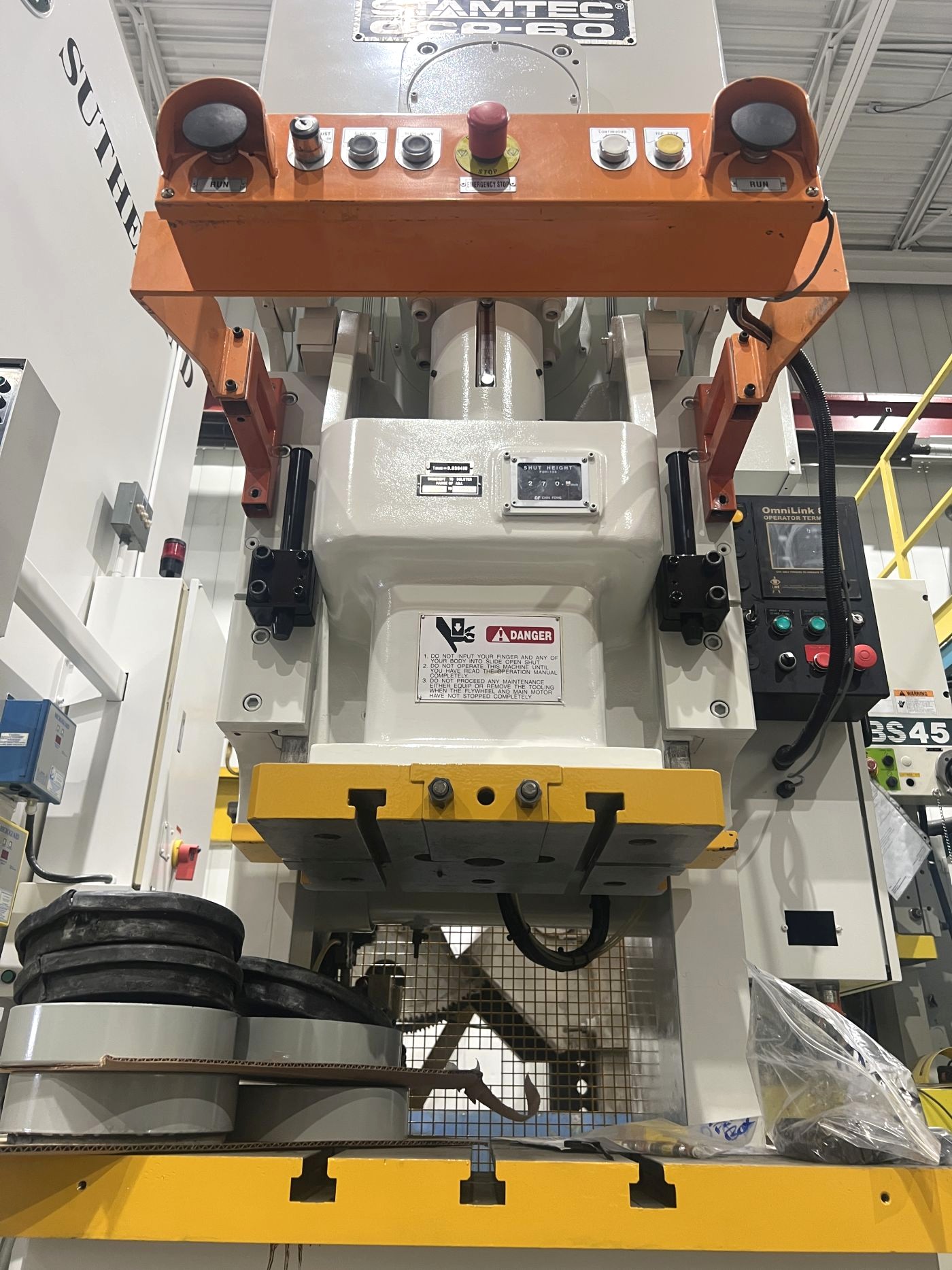 | CAPACITY | 66 US TONS | STROKE | APPROX. 3.55" | max die height | APPROX. 10.64" sdau over bolster | BED AREA | 35.5" X 15.8" (RL X FB) | SLIDE AREA | 19.7" X 15.8" (RL X FB) (t-slot) | slide ADJUSTMENT | APPROX. 2.76" motorized | SPEED | APPROX. 60 - 120 SPM | BOLSTER PLATE | 35.5" X 15.8" x 3.5" (RL X FB x h) (t-slot) | DISTANCE BETWEEN UPRIGHTS | 21" | FLOOR TO BED HEIGHT | 32.5" | AIR CLUTCH | STAMTEC AIR CLUTCH AND BRAKE ASSEMBLY | PRESS CONTROLS | OMNILINK 805 LINK CONTROLLER MODEL 5100 | ELECTRIC MOTOR | 10 HP 480V-3-60 MOTOR | 25 AMPS | DIMENSIONS | 48" x 72" (rl x fb) x 110" High | WEIGHT | 9,800 lbs | Equipped With | HYDRAULIC OVERLOAD PROTECTION, LOW DEFLECTION, SUPER RIGID STEEL FRAME, EXTRA LONG 6 PT CENTERED GIBS, REMOVABLE BOLSTER & SLIDE PLATE, AUTOMATIC LUBRICATION SYSTEM, DUAL AIR COUNTERBALANCES, SINGLE BACK GEARED DESIGN, FLOOR STANDING | Note | 60 PSI MAX. AIR PRESSURE 661 LBS. MAX. UPPER DIE WEIGHT |