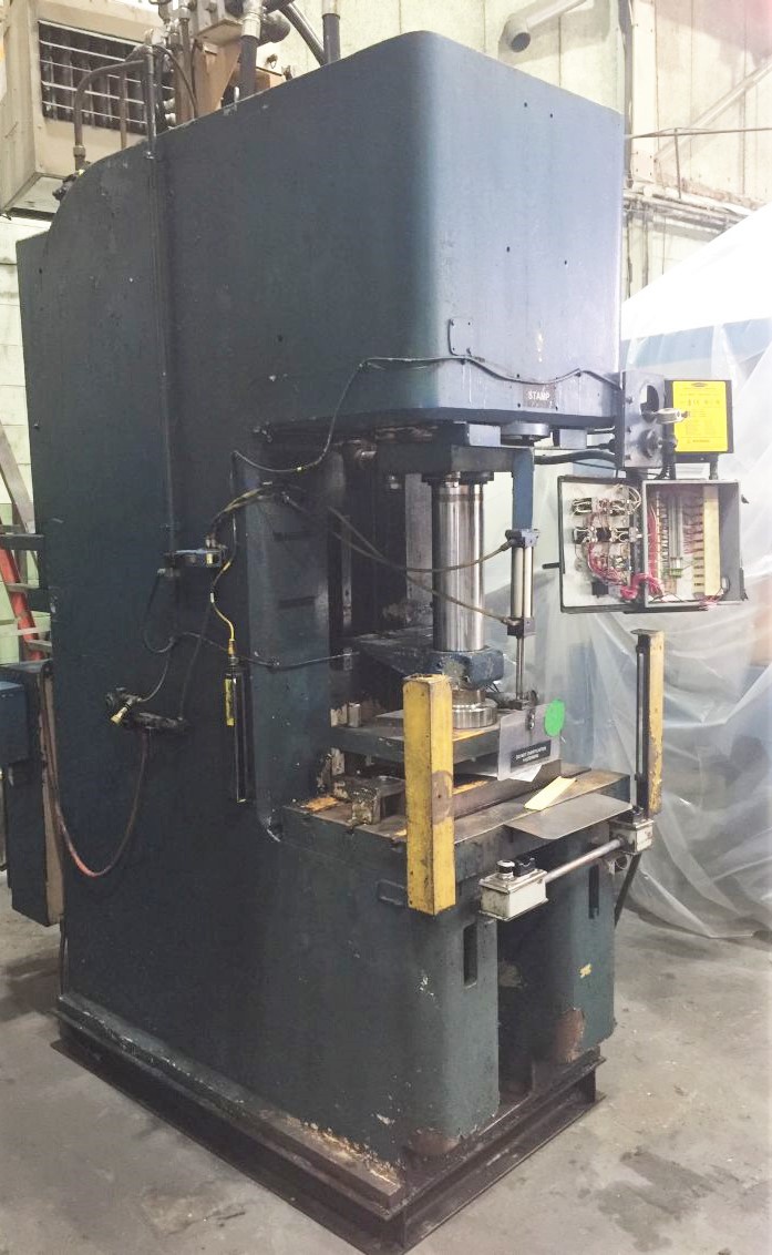 | MAX. CAPACITY | 75 TONS | MAX. STROKE | APPROX. 18" | MAX. DAYLIGHT TO BED | APPROX. 25" | BED AREA | 34.5" X 20.5" (RL X FB) X 4" THICK T-SLOT BOLSTER PLATE | RAM AREA | 8" DIA | THROAT DEPTH | 14" | CYLINDER SIZE | -- | ROD SIZE | APPROX. 5" | DISTANCE FROM FLOOR TO BED | 37" | PRESS CONTROLS | ALLEN-BRADLEY SLC 5/01 CPU CONTROLLER | HYDRAULICS | VICKERS PUMP PVH57QIC RAF 1S 10 | MODEL OM7 31 1997 PUMP | ELECTRIC MOTOR | 480V | APPROX. DIMENSIONS | 68" X 94" (RL X FB) X 144" HIGH | APPROX. WEIGHT | APPROX 15,000 LBS | Equipped With | FINGER SWITCHES RAM CENTERING SUPPORT BRACKET | Note | __ |