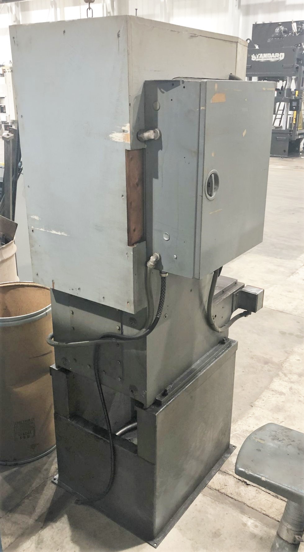 | CAPACITY | 8 TONS AT 1,930 PSI | MAX STROKE | 12" | max. daylight to bed | 18" | bed area | 20" X 13.5" (RL x FB) | BOLSTER PLATE | 17.5" X 12" (RL X FB) X 1" THICK SOLID BOLSTER PLATE | RAM DIA. | 2.25" DIA. | CYLINDER SIZE | 3.25" DIA. BORE | THROAT DEPTH | 7" | FLOOR TO BED | -- | SPEED | -- | HYDRAULICS | TMB-006-21R-4 HYDRAULIC PUMP, 9 GALLONS PER MINUTE, 18 GALLON TANK | PRESS CONTROLS | SQUARE D RELAY LOGIC CONTROLS | ELECTRICS | 7.5 HP MOTOR, 230V-6-60 | APPROX. DIMENSIONS | -- | APPROX. WEIGHT | 1,500 LBS. | Equipped With | DUAL PALM BUTTONS | Note | __ |