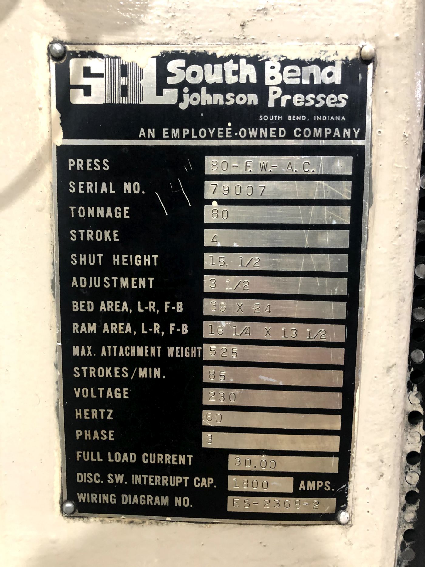 | CAPACITY | 80 TONS | STROKE | 4" | MAX. SHUT HEIGHT TO BED | 15.5" | BED AREA | 36" X 24" (RL X FB) | RAM AREA | 16.25" X 13.5" (RL X FB) | RAM ADJUSTMENT | 3.5" | SPEED | 85 SPM | BOLSTER PLATE | 36" X 24" (RL X FB) X 3.5" THICK T-SLOTTED BOLSTER PLATE | DISTANCE BETWEEN UPRIGHTS | 17.5" | FLOOR TO BED | 33.5" | THROAT DEPTH | 14" | CLUTCH | AIR CLUTCH & BRAKE | PRESS CONTROLS | SSM PRESS CONTROL MODEL SSM-10 (R7I) | ELECTRICAL | 7.5 HP 230/460V-3-60 LINCOLN MOTOR | 30/15 AMPS | APPROX. DIMENSIONS | 77" X 82" (RL X FB) X 123" HIGH | APPROX. WEIGHT | 16,500 LBS. | Equipped With | __ | Note | __ |