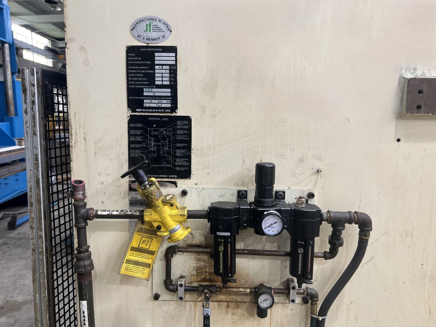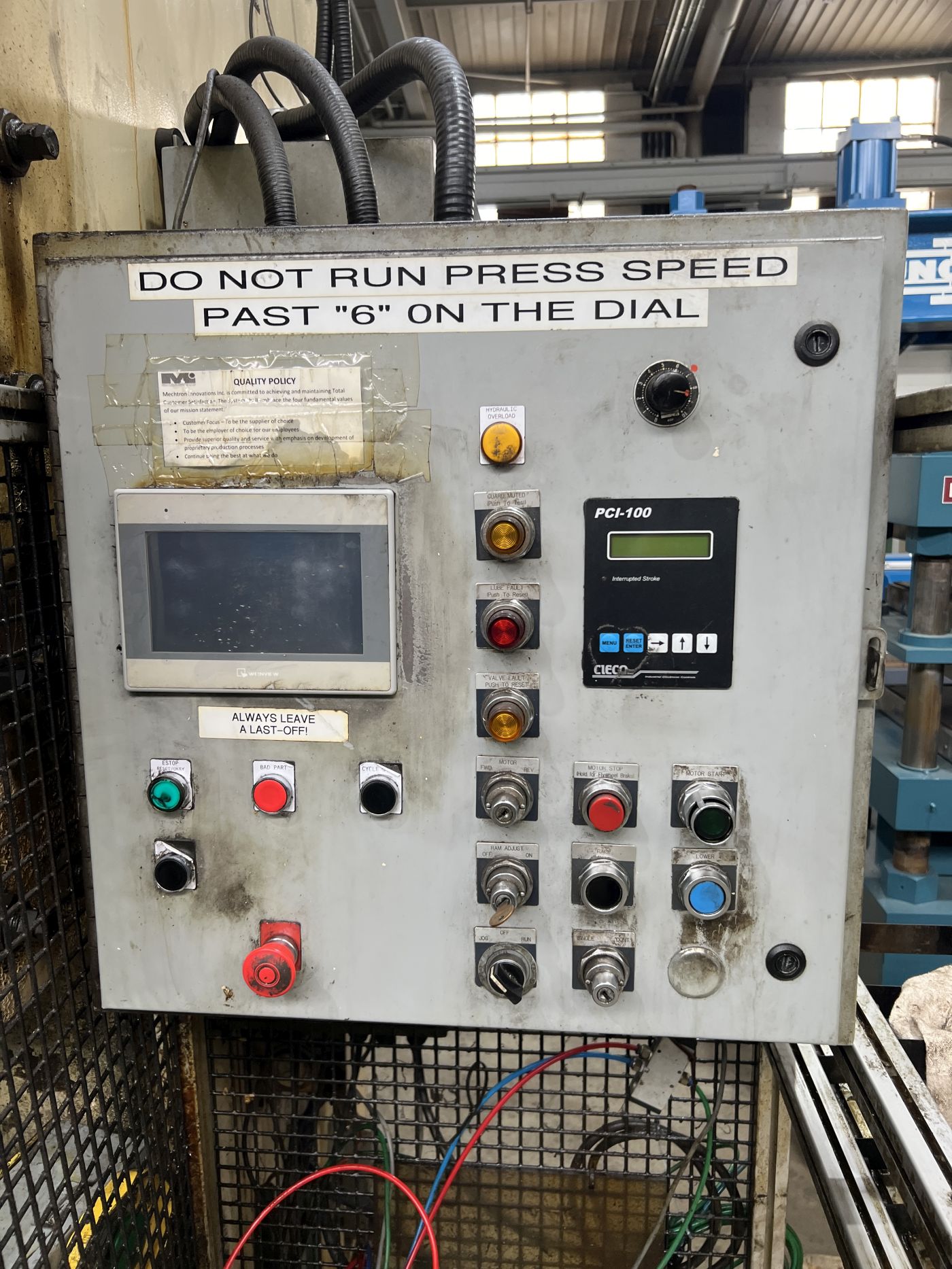 | CAPACITY | 88 US TONS | STROKE | 3.15″ | MAX DIE HEIGHT | 13.78″ TO BOLSTER PLATE | 19.29″ TO BED | BED AREA | 47.63″ X 19.69″ (RL X FB) | SPEED | 30 – 160 SPM | RAM / SLIDE ADJUSTMENT | 3.15″ | RAM / SLIDE AREA | 31.5″ X 17.72″ (RL X FB) | BOLSTER PLATE | 47.63″ X 19.69″ (RL X FB) X 5.51″ THICK T-SLOTTED BOLSTER PLATE | DISTANCE BETWEEN UPRIGHTS | 32″ | FLOOR TO BED HEIGHT | 38″ | THROAT DEPTH | 10.25″ | CLUTCH | KOMATSU AIR CLUTCH / BRAKE COMBINATION | PRESS CONTROLS | CIECO PCI-100 CONTROLLER WITH OMRON SYSMAC CP1H | ELECTRIC MOTOR | __ | APPROX DIMENSIONS | __ | APPROX WEIGHT | __ | Equipped With | oil cooler floor standing cast steel frame TWO PLUNGER GUIDES FOR IMPROVED ACCURACY | Note | __ |
