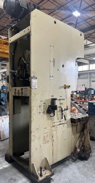 | CAPACITY | 88 US TON | STROKE | 2.8″ | MAX DIE HEIGHT | 14.6″ SDAU OVER | BED AREA | 39.4″ RL X 21.7″ FB | SPEED | 50 – 120 SPM | SLIDE ADJUSTMENT | 3.2″ MOTORIZED | SLIDE AREA | 22.1″ RL X 16.5″ FB (T-SLOTTED) | BOLSTER PLATE | 39.4″ RL X 21.7″ FB (T-SLOTTED) | DISTANCE BETWEEN UPRIGHTS | 21″ | DISTANCE FLOOR TO BED | 29″ | CLUTCH | STAMTEC AIR CLUTCH / BRAKE COMBINATION | ELECTRICS | 10 HP 1750 RPM 240/480V-3-60 EDDY CURRENT DRIVE & STAMTEC PRESS CONTROL | APPROX DIMENSIONS | 125″ H (INCL MOTOR) X 60″ RL X 75″ FB | APPROX WEIGHT | 14,500 lbs | Equipped With | HYDRAULIC OVERLOAD PROTECTION, LOW DEFLECTION, SUPER RIGID STEEL FRAME, EXTRA LONG 6 PT CENTERED GIBS, REMOVABLE BOLSTER & SLIDE PLATE, AUTOMATIC LUBRICATION SYSTEM, DUAL AIR COUNTERBALANCES, SINGLE BACK GEARED DESIGN, FLOOR STANDING | Note |