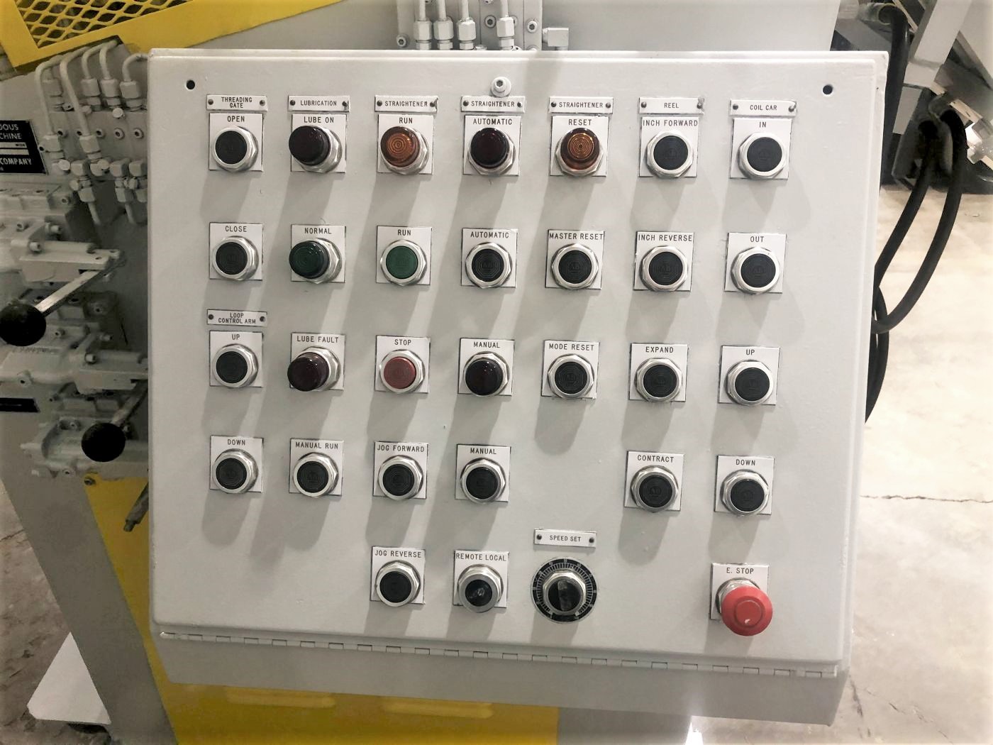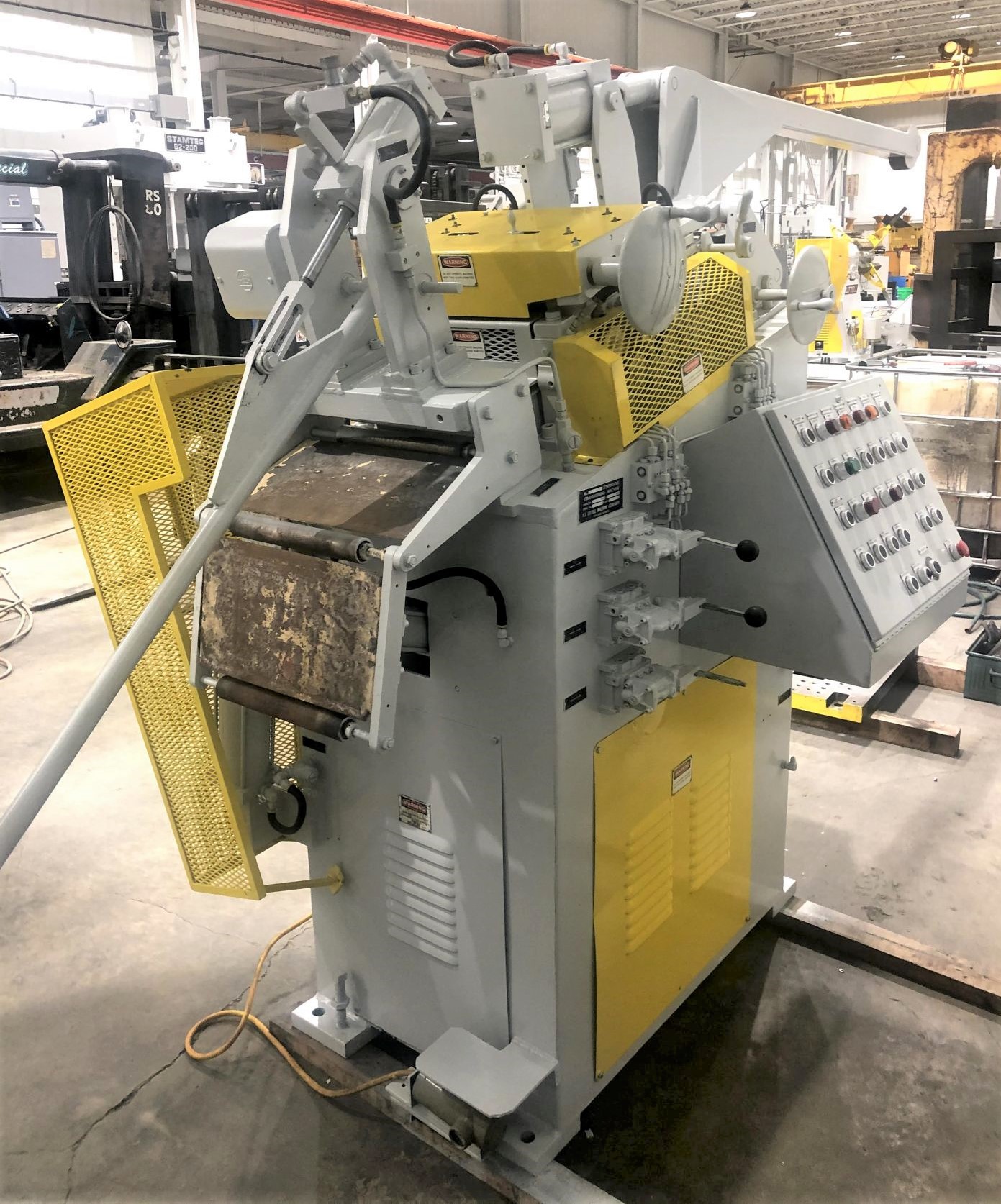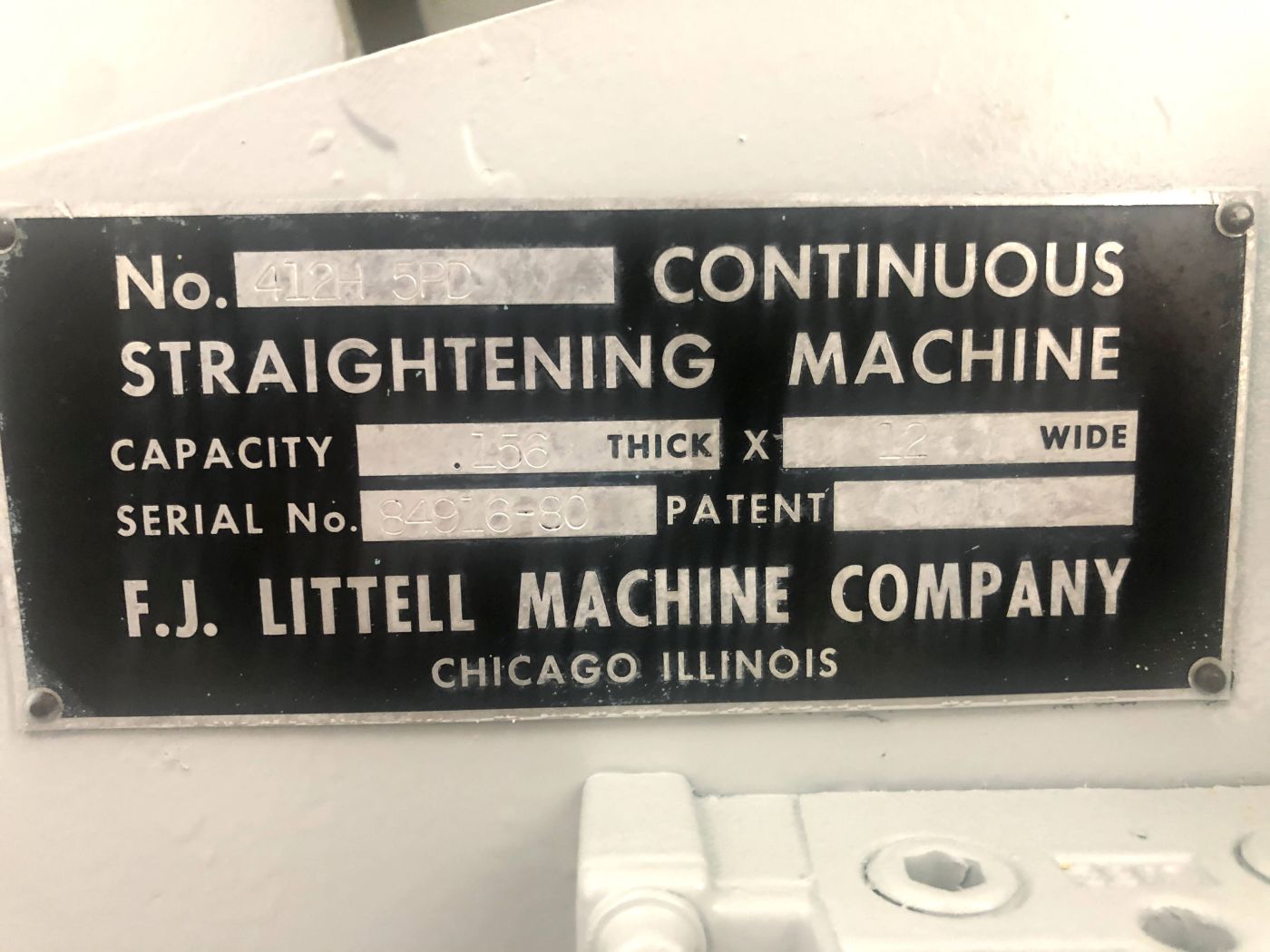 | CAPACITY | .156″ X 12″ WIDE | STRAIGHTENING ROLL SIZE | 3.125″ Dia. x 12.5″ Wide Rolls (3 over 2) | POWER PINCH ROLL SIZE | 4.25″ DIA. X 12.5″ WIDE (ENTRY/EXIT) | ELECTRIC MOTOR | VARI-SPEED MOTOR | CONTROLS | COMPLETE RELAY LOGIC | APPROX. DIMENSIONS | 154″ X 60″ (RL X FB) X 90″ HIGH | APPROX. WEIGHT | 10,000 LBS. | Equipped With | stock peeler overarm & thread table all motors & controls | Note | __ |